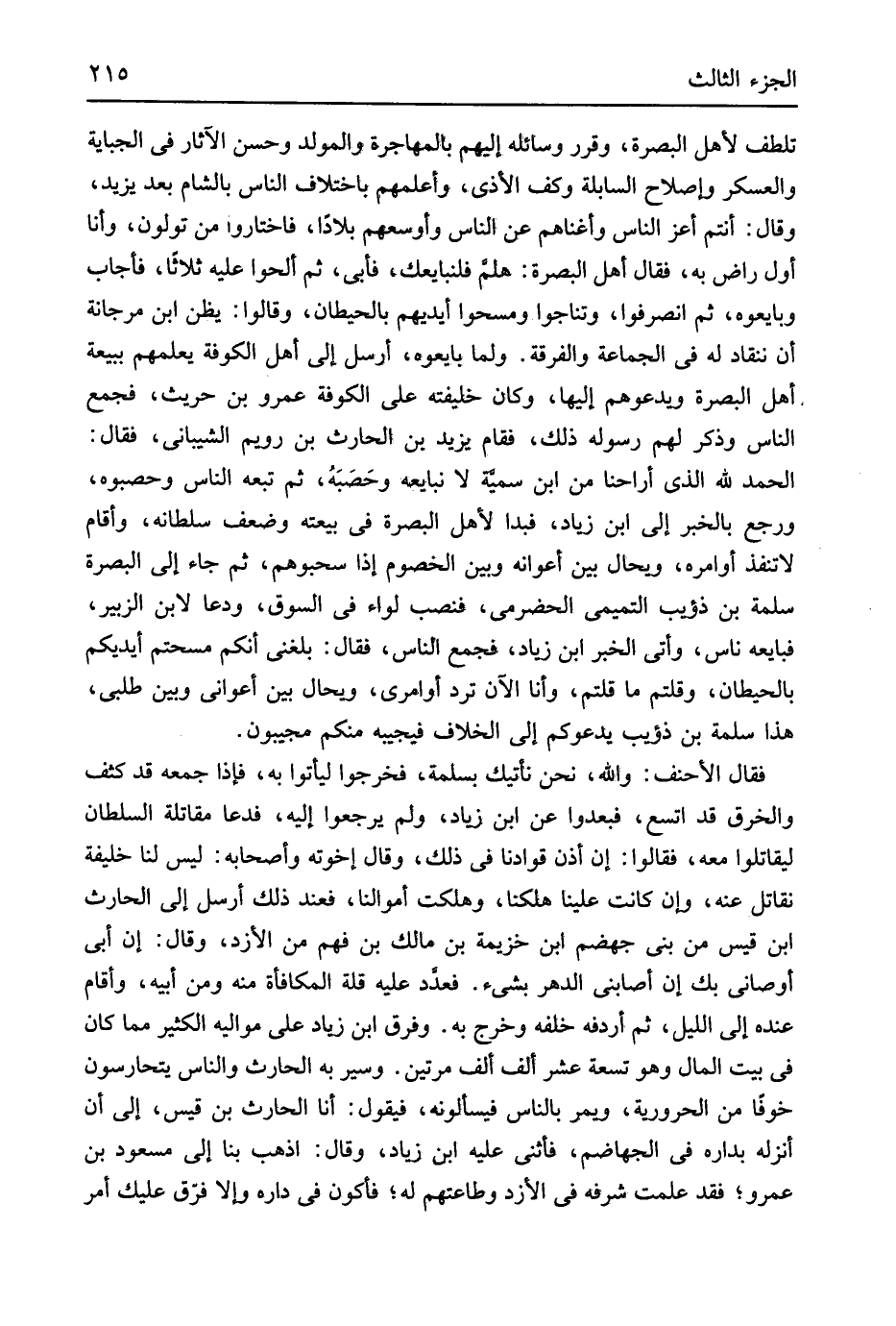 تلطف لأهل الْبَصْرَة وَقرر وسائله إِلَيْهِم بالمهاجرة والمولد وَحسن الآَثار فِي الجباية والعسكر وَإِصْلَاح السابلة وكف الْأَذَى وأعلمهم باخْتلَاف النَّاس بِالشَّام بعد يزِيد وَقَالَ أَنْتُم أعز النَّاس وأغناهم عَن النَّاس وأوسعهم بلاداً فَاخْتَارُوا من تولون وَأَنا أول رَاض بِهِ فَقَالَ أهل الْبَصْرَة هَلُمَّ فلنبايعك فَأبى ثمَّ ألحوا عَلَيْهِ ثَلَاثًا فَأجَاب وَبَايَعُوهُ ثمَّ انصرفوا وتناجوا ومسحوا أَيْديهم بالحيطان وَقَالُوا يظنّ ابْن مرْجَانَة أَن ننقاد لَهُ فِي الْجَمَاعَة والفرقة وَلما بَايعُوهُ أرسل إِلَى أهل الْكُوفَة يعلمهُمْ ببيعة أهل الْبَصْرَة ويدعوهم إِلَيْهَا وَكَانَ خَلِيفَته على الْكُوفَة عَمْرو بن حُرَيْث فَجمع النَّاس وَذكر لَهُم رَسُوله ذَلِك فَقَامَ يزِيد بن الْحَارِث بن رُوَيْم الشَّيْبَانِيّ فَقَالَ الْحَمد لله الَّذِي أراحنا من ابْن سميَّة لَا نُبَايِعهُ وحَصَبَهُ ثمَّ تبعه النَّاس وحصبوه وَرجع بالْخبر إِلَى ابْن زِيَاد فَبَدَا لأهل الْبَصْرَة فِي بيعَته وَضعف سُلْطَانه وَأقَام لَا تنفذ أوامره ويحال بَين وَبَين أعوانه وَبَين الْخُصُوم إِذا سحبوهم ثمَّ جَاءَ إِلَى الْبَصْرَة سَلمَة بن ذُؤَيْب التَّمِيمِي الْحَضْرَمِيّ فنصب لِوَاء فِي السُّوق ودعا لِابْنِ الزبير فَبَايعهُ نَاس وَآتى الْخَبَر ابْن زِيَاد فَجمع النَّاس فَقَالَ بَلغنِي أَنكُمْ مسحتم أَيْدِيكُم بالحيطان وقلتم مَا قُلْتُمْ وَأَنا الْآن ترد أوامري ويحال بَين أعواني وَبَين طلبي هَذَا سَلمَة بن ذُؤَيْب يدعوكم إِلَى الْخلاف فَيُجِيبهُ مِنْكُم مجيبون فَقَالَ الْأَحْنَف وَالله نَحن نَأْتِيك بسلمة فَخَرجُوا ليأتوا بِهِ فَإِذا جمعه قَد كثف والخرق قد اتَّسع فبعدوا عَن ابْن زِيَاد وَلم يراجعوا إِلَيْهِ فَدَعَا مقاتلة السُّلْطَان لِيُقَاتِلُوا مَعَه فَقَالُوا إِن أذن قوادنا فِي ذَلِك وَقَالَ أخوته وَأَصْحَابه لَيْسَ لنا خَليفَة نُقَاتِل عَنهُ وَإِن كَانَت علينا هلكنا وَهَلَكت أَمْوَالنَا فَعِنْدَ ذَلِك أرسل إِلَى الْحَارِث ابْن قيس من بني جَهْضَم ابْن خُزَيْمَة بن مَالك بن فهم من الأزد وَقَالَ إِن أبي أَوْصَانِي بك إِن أصابني الدَّهْر بِشَيْء فعدد عَلَيْهِ قلَّة الْمُكَافَأَة مِنْهُ وَمن أَبِيه وَأقَام عِنْده إِلَى اللَّيْل ثمَّ أردفه خَلفه وَخرج بِهِ وَفرق ابْن زِيَاد على موَالِيه الْكثير مِمَّا كَانَ فِي بَيت المَال وَهُوَ تِسْعَة عشر ألف ألف مرَّتَيْنِ وسير بِهِ الْحَارِث وَالنَّاس يتحارسون خوفًا من الحرورية ويمر بِالنَّاسِ فيسألونه فَيَقُول أَنا الْحَارِث بن قيس إِلَى أَن أنزلهُ بداره فِي الجهاضم فَأثْنى عَلَيْهِ ابْن زِيَاد وَقَالَ اذْهَبْ بِنَا إِلَى مَسْعُود بن عَمْرو فقد علمت شرفه فِي الأزد وطاعتهم لَهُ فَأَكُون فِي دَاره وَإِلَّا فرق عَلَيْك أَمر