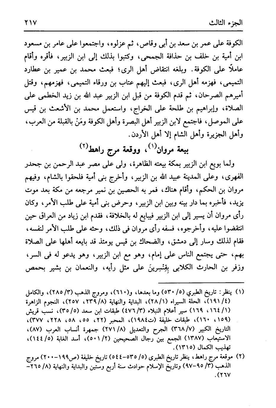 الْكُوفَة على عمر بن سعد بن أبي وَقاص ثمَّ عزلوه واجتمعوا على عَامر بن مَسْعُود ابْن أُميَّة بن خلف بن حذافة الجُمَحِي وَكَتَبُوا بذلك إِلَى ابْن الزبير فأقره وَأقَام عَاملا على الْكُوفَة وبلغه انْتِقَاض أهل الرّيّ فَبعث مُحَمَّد بن عُمَيْر بن عُطَارِد التَّمِيمِي فَهَزَمَهُ أهل الرّيّ فَبعث إِلَيْهِم عتاب بن وَرْقَاء التَّمِيمِي فَهَزَمَهُمْ وَقتل أَمِيرهمْ الصرحان ثمَّ قدم الْكُوفَة من قبل ابْن الزبير عبد الله بن زيد الخطمي على الصَّلَاة وَإِبْرَاهِيم بن طَلْحَة على الْخراج وَاسْتعْمل مُحَمَّد بن الْأَشْعَث بن قيس على الْموصل فَاجْتمع لِابْنِ الزبير أهل الْبَصْرَة وَأهل الْكُوفَة ومَنْ بالقبلة من الْعَرَب وَأهل الجزيرة وَأهل الشَّام إِلَّا أهل الْأُرْدُن