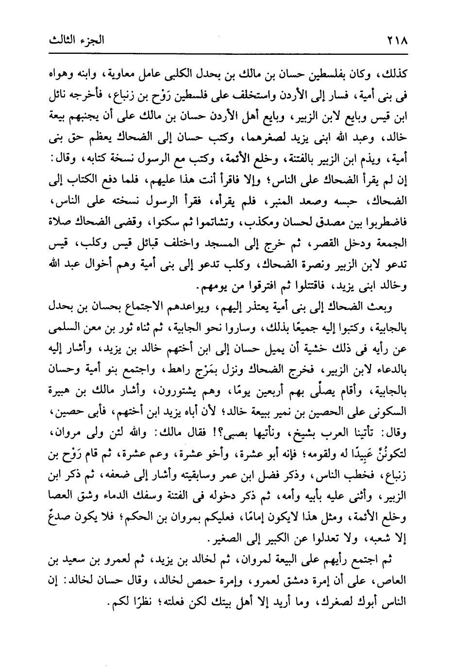 كَذَلِك وَكَانَ بفلسطين حسان بن مَالك بن بَحْدَل الْكَلْبِيّ عَامل مُعَاوِيَة وَابْنه وهواه فِي بني أُميَّة فَسَار إِلَى الْأُرْدُن واستخلف على فلسطين رَوح بن زنباع فَأخْرجهُ نائل ابْن قيس وَبَايع لِابْنِ الزبير وَبَايع أهل الْأُرْدُن حسان بن مَالك على أَن يجنبهم بيعَة خَالِد وَعبد الله ابْني يزدْ لصغرهما وَكتب حسان إِلَى الضَّحَّاك يعظم حق بني أُميَّة ويذم ابْن الزبير بالفتنة وخلع الْأَئِمَّة وَكتب مَعَ الرَّسُول نُسْخَة كِتَابه وَقَالَ إِن لم يقْرَأ الضَّحَّاك على النَّاس وَإِلَّا فاقرأ أَنْت هَذَا عَلَيْهِم فَلَمَّا دفع الْكتاب إِلَى الضَّحَّاك حَبسه وَصعد الْمِنْبَر فَلم يقرأه فَقَرَأَ الرَّسُول نسخته على النَّاس فاضطربوا بَين مُصدق لحسان ومكذب وتشاتموا ثمَّ سكتوا وَقضى الضَّحَّاك صَلَاة الْجُمُعَة وَدخل الْقصر ثمَّ خرج إِلَى الْمَسْجِد وَاخْتلف قبائل قيس وكلب قيس تَدْعُو لِابْنِ الزبير ونصرة الضَّحَّاك وكلب تَدْعُو إِلَى بني أُميَّة وهم أخوال عبد الله وخَالِد ابْني يزِيد فَاقْتَتلُوا ثمَّ افْتَرَقُوا من يومهم وَبعث الضَّحَّاك إِلَى بني أُميَّة يعْتَذر إِلَيْهِم ويواعدهم الِاجْتِمَاع بِحسان بن بَحْدَل بالجابية وَكَتَبُوا إِلَيْهِ جَمِيعًا بذلك وَسَارُوا نَحْو الْجَابِيَة ثمَّ ثناه ثَوْر بن معن السّلمِيّ عَن رَأْيه فِي ذَلِك خشيَة أَن يمِيل حسان إِلَى ابْن أختهم خَالِد بن يزِيد وَأَشَارَ إِلَيْهِ بِالدُّعَاءِ لِابْنِ الزبير فَخرج الضَّحَّاك وَنزل بمَرج راهط وَاجْتمعَ بَنو أُميَّة وَحسان بالجابية وَأقَام يُصَلِّي بهم أَرْبَعِينَ يَوْمًا وهم يتشورون وَأَشَارَ مَالك بن هُبَيْرَة السكونِي على الْحصين بن نمير ببيعة خَالِد لِأَن أَبَاهُ يزِيد ابْن أختهم فَأبى حُصَيْن وَقَالَ تَأْتِينَا الْعَرَب بشيخ ونأتيها بصبي فَقَالَ مَالك وَالله لَئِن ولي مَرْوَان لتكونُن عَبِيدَاً لَهُ ولقومه فَإِنَّهُ أَبُو عشرَة وأخو عشرَة وَعم عشرَة ثمَّ قَامَ رَوح بن زنباع فَخَطب النَّاس وَذكر فضل ابْن عمر وسابقيته وَأَشَارَ إِلَى ضعفه ثمَّ ذكر ابْن الزبير وَأثْنى عَلَيْهِ بِأَبِيهِ وَأمه ثمَّ ذكر دُخُوله فِي الْفِتْنَة وَسَفك الدِّمَاء وشق الْعَصَا وخلع الْأَئِمَّة وَمثل هَذَا لَا يكون إمامَاً فَعَلَيْكُم بِمَرْوَان بن الحكم فَلَا يكون صدع إِلَّا شعبه وَلَا تعدلوا عَن الْكَبِير إِلَى الصَّغِير ثمَّ اجْتمع رَأْيهمْ على الْبيعَة لمروان ثمَّ لخَالِد بن يزِيد ثمَّ لعَمْرو بن سعيد بن الْعَاصِ على أَن إمرة دمشق لعَمْرو وإمرة حمص لخَالِد وَقَالَ حسان لخَالِد إِن النَّاس أَبوك لصغرك وَمَا أُرِيد لَا أهل بتك لَكِن فعلته نظرَاً لكم