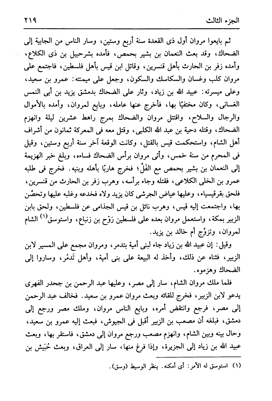ثمَّ بَايعُوا مَرْوَان أول ذِي الْقعدَة سنة أَربع وَسِتِّينَ وَسَار النَّاس من الْجَابِيَة إِلَى الضَّحَّاك وَقد بعث النُّعْمَان بن بشير بحمص فأمده بشرحبيل بن ذِي الكلاع وأمده زفر بن الْحَارِث بِأَهْل قنسرين وَقَاتل ابْن قيس بِأَهْل فلسطين فَاجْتمع على مَرْوَان كلب وغسان والسكاسك والسكون وَجعل على ميمنته عَمْرو بن سعيد وعَلى ميسرته عبيد الله بن زِيَاد وثار على الضَّحَّاك بِدِمَشْق يزِيد بن أبي النمس الغساني وَكَانَ مختفيَاً بهَا فَأخْرج عَنْهَا عَامله وَبَايع لمروان وأمده بالأموال وَالرِّجَال وَالسِّلَاح واقتتل مَرْوَان وَالضَّحَّاك بمرج راهط عشْرين لَيْلَة وَانْهَزَمَ الضَّحَّاك وَقَتله دحْيَة بن عبد الله الْكَلْبِيّ وَقتل مَعَه فِي المعركة ثَمَانُون من أَشْرَاف أهل الشَّام واستحكمت قيس بِالْقَتْلِ وَكَانَت الْوَقْعَة آخر سنة أَربع وَسِتِّينَ وَقيل فِي الْمحرم من سنة خمس وَآتى مَرْوَان بِرَأْس الضَّحَّاك فساءه وَبلغ خبر الْهَزِيمَة إِلَى النُّعْمَان بن بشير بحمص مَعَ الفَل فَخرج هَارِبا بأَهْله وبنيه فَخرج فِي طلبه عَمْرو بن الخلي الكلَاعِي فَقتله وَجَاء بِرَأْسِهِ وهرب زفر بن الْحَارِث من قنسرين فلحق بقرقيساء وَعَلَيْهَا عِيَاض الجرشِي كَانَ يزِيد ولاه فخدعه وغلبه عَلَيْهَا وتحصن بهَا وَاجْتمعت إِلَيْهِ قيس وهرب نائل بن قيس الجذامي عَن فلسطين وَلحق بِابْن الزبير بِمَكَّة وَاسْتعْمل مَرْوَان بعده على فلسطين رَوح بن زنباع واستوسق الشَّام لمروان وَتزَوج أم خَالِد بن يزِيد وَقيل إِن عبيد الله بن زِيَاد جَاءَ لبني أُميَّة بتدمر ومروان مجمع على الْمسير لِابْنِ الزبير فثناه عَن ذَلِك وَأخذ لَهُ الْبيعَة على بني أُميَّة وَأهل تدمر وَسَارُوا إِلَى الضَّحَّاك وهزموه فبمَا ملك مَرْوَان الشَّام سَار إِلَى مصر وَعَلَيْهَا عبد الرَّحْمَن بن جحدر الفِهري يَدْعُو لِابْنِ الزبير فَخرج للقائه وَبعث مَرْوَان عَمْرو بن سعيد فَخَالف عبد الرَّحْمَن إِلَى مصر فَرجع وانتقض أمره وَبَايع النَّاس مَرْوَان وَملك مصر وَرجع إِلَى دمشق فَبَلغهُ أَن مُصعب بن الزبير أقبل فِي الجيوش فَبعث إِلَيْهِ عَمْرو بن سعيد وَحَال بَينه وَبَين الشَّام وَانْهَزَمَ مُصعب وَرجع مَرْوَان إِلَى دمشق فاستقر بهَا وَبعث عبيد الله بن زِيَاد إِلَى الجزيرة وَإِذا فرغ مِنْهَا سَار إِلَى الْعرَاق وَبعث حُبَيْش بن