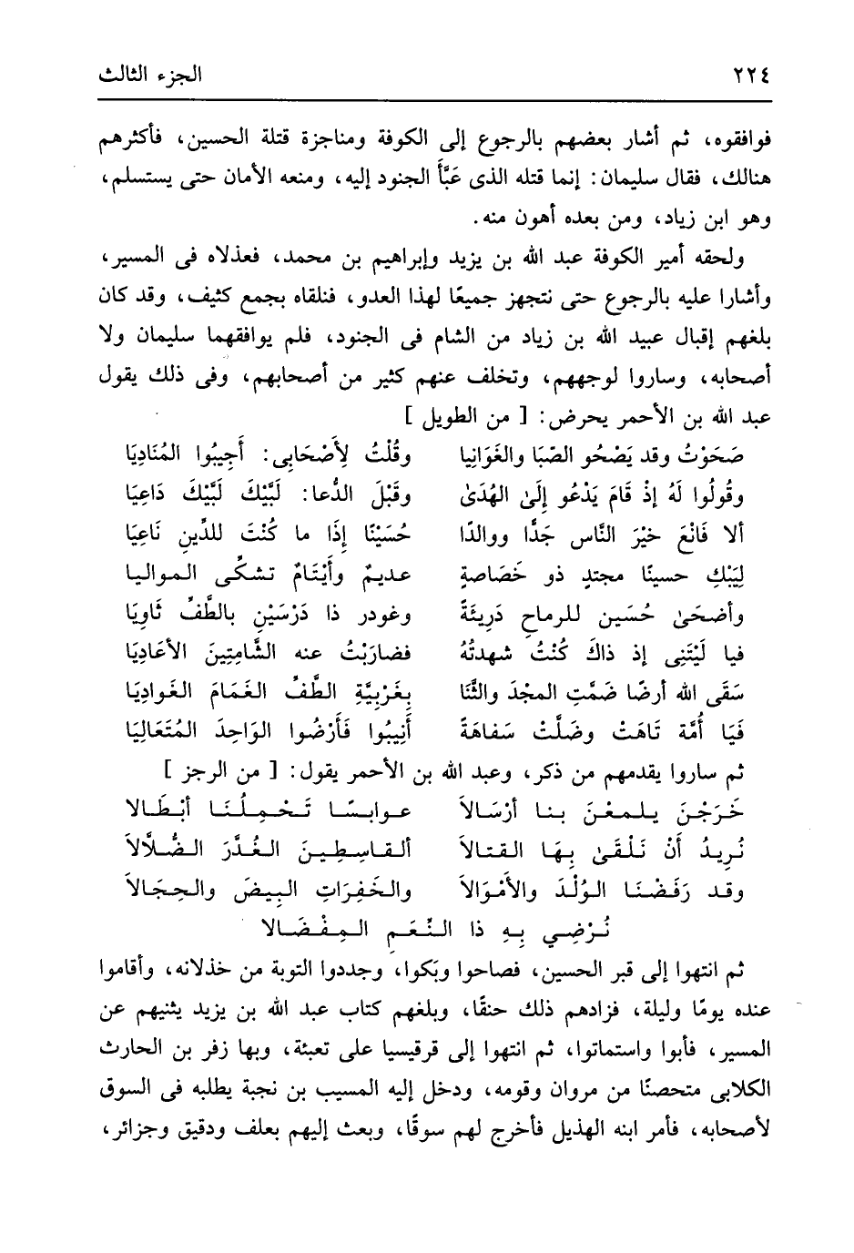 فوافقوه ثمَّ أَشَارَ بَعضهم بِالرُّجُوعِ إِلَى الْكُوفَة ومناجزة قتلة الْحُسَيْن فأكثرهم هُنَالك فَقَالَ سُلَيْمَان إِنَّمَا قَتله الَّذِي عَبأَ الْجنُود إِلَيْهِ وَمنعه الْأمان حَتَّى يستسلم وَهُوَ ابْن زِيَاد وَمن بعده أَهْون مِنْهُ ولحقه أَمِير الْكُوفَة عبد الله بن يزِيد وبراهيم بن مُحَمَّد فعذلاه فِي الْمسير وأشارا عَلَيْهِ بِالرُّجُوعِ حَتَّى نتجهز جَمِيعًا لهَذَا الْعَدو فنلقاه بِجمع كثيف وَقد كَانَ بَلغهُمْ إقبال عبيد الله بن زِيَاد من الشَّام فِي الْجنُود فَلم يوافقهما سُلَيْمَان وَلَا أَصْحَابه وَسَارُوا لوجههم وتخلف عَنْهُم كثير من أَصْحَابهم وَفِي ذَلِك يَقُول عبد الله بن الْأَحْمَر يحرض من // (الطَّوِيل) //