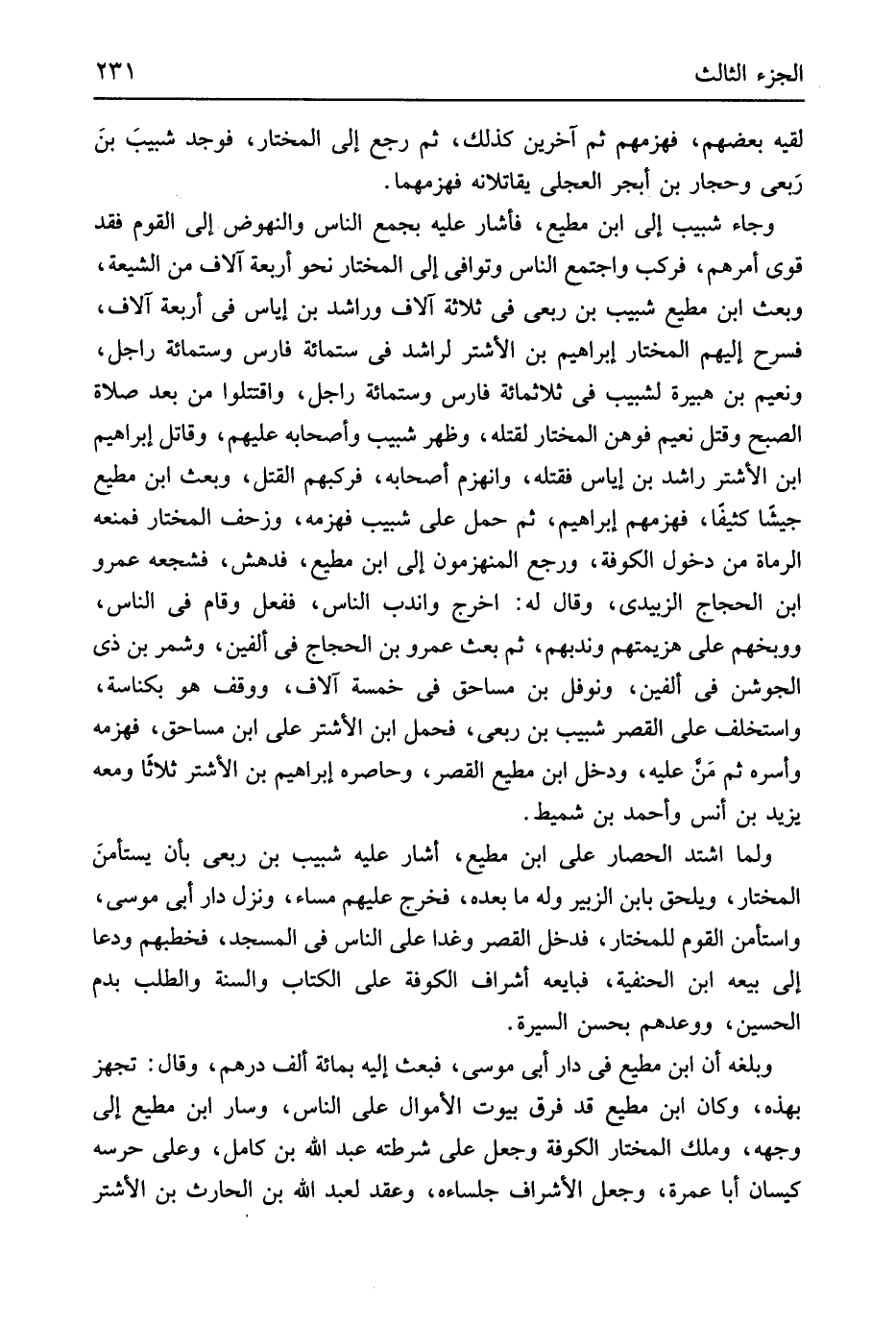 لقِيه بَعضهم فَهَزَمَهُمْ ثمَّ آخَرين كَذَلِك ثمَّ رَجَعَ إِلَى الْمُخْتَار فَوجدَ شبيبَ بنَ رَبعي وحجار بن أبجر الْعجلِيّ يقاتلانه فهومهما وَجَاء شَبَّبَ إِلَى ابْن مُطِيع فَأَشَارَ عَلَيْهِ بِجمع النَّاس والنهوض إِلَى الْقَوْم فقد قوي أَمرهم فَركب وَاجْتمعَ النَّاس وتوافي إِلَى الْمُخْتَار نَحْو أَرْبَعَة آلَاف من الشِّيعَة وَبعث ابْن مُطِيع شبيب بن ربعي فِي ثَلَاثَة آلَاف وَرَاشِد بن إِيَاس فِي أَرْبَعَة آلَاف فسرح إِلَيْهِم الْمُخْتَار إِبْرَهِيمُ بن الأشتر لراشد فِي سِتّمائَة فَارس وسِتمِائَة راجل ونعيم بن هُبَيْرَة لشيب فِي ثَلَاثمِائَة فَارس وسِتمِائَة راجل واقتتلوا من بعد صَلَاة الصُّبْح وَقتل نعيم فوهن الْمُخْتَار لقَتله وَظهر شبيب وَأَصْحَابه عَلَيْهِم وَقَاتل إِبْرَاهِيم ابْن الأشتر رَاشد بن إِيَاس فَقتله وَانْهَزَمَ أَصْحَابه فركبهم الْقَتْل وَبعث ابْن مُطِيع جَيْشًا كثيفاً فَهَزَمَهُمْ إِبْرَاهِيم ثمَّ حمل على شبيب فَهَزَمَهُ وزحف الْمُخْتَار فَمَنعه الرُّمَاة من دُخُول الْكُوفَة وَرجع المنهزمون إِلَى ابْن مُطِيع فدهش فشجعه عَمْرو ابْن الْحجَّاج الزبيدِيّ وَقَالَ لَهُ اخْرُج واندب النَّاس فَفعل وَقَامَ فِي النَّاس ووبخهم على هزيمتهم وندبهم ثمَّ بعث عَمْرو بن الْحجَّاج فِي أَلفَيْنِ وشمر بن ذِي الجوشن فِي أَلفَيْنِ وَنَوْفَل بن مساحق فِي خَمْسَة آلَاف ووقف هُوَ بكناسة واستخلف على الْقصر شبيب بن ربعي فَحمل ابْن الأشتر على ابْن مساحق فَهَزَمَهُ وأسره ثمَّ مَن عَلَيْهِ وَدخل ابْن مُطِيع الْقصر وحاصره إِبْرَاهِيم الأشتر ثَلَاثًا وَمَعَهُ يزِيد بن أنس وَأحمد بن شميط وَلما اشْتَدَّ الْحصار على ابْن مُطِيع أَشَارَ عَلَيْهِ شبيب بن ربعي بِأَن يستأمنَ الْمُخْتَار وَيلْحق بِابْن الزبير وَله مَا بعده فَخرج عَلَيْهِم مسَاء وَنزل دَار أبي مُوسَى وَاسْتَأْمَنَ الْقَوْم للمختار فَدخل الْقصر وَغدا على النَّاس فِي الْمَسْجِد فخطبهم ودعا إِلَى بَيْعه ابْن الْحَنَفِيَّة فَبَايعهُ أَشْرَاف الْكُوفَة على الْكتاب وَالسّنة والطلب بِدَم الْحُسَيْن وَوَعدهمْ بِحسن السِّيرَة وبلغه أَن ابْن مُطِيع فِي دَار أبي مُوسَى فَبعث إِلَيْهِ بِمِائَة ألف دِرْهَم وَقَالَ تجهز بِهَذِهِ وَكَانَ ابْن مُطِيع قد فرق بيُوت الْأَمْوَال على النَّاس وَسَار ابْن مُطِيع إِلَى وَجهه وَملك الْمُخْتَار الْكُوفَة وَجعل على شريطة عبد الله بن كَامِل وعَلى حرسه كيسَان أَبَا عمْرَة وَجعل الْأَشْرَاف جلساءه وَعقد لعبد الله بن الْحَارِث بن الأشتر