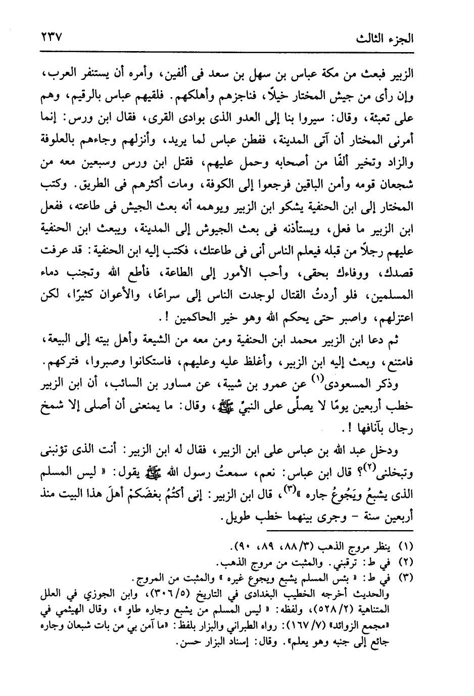 الزبير فَبعث من مَكَّة عَبَّاس بن سهل بن سعد فِي أَلفَيْنِ وَأمره أَن يستنفر الْعَرَب وَإِن رأى من جَيش الْمُخْتَار خيلا فناجزهم وأهلكهم فَلَقِيَهُمْ عَبَّاس بالرقيم وهم على تعبئة وَقَالَ سِيرُوا بِنَا إِلَى الْعَدو الَّذِي بوادي الْقرى فَقَالَ ابْن ورس إِنَّمَا أَمرنِي الْمُخْتَار أَن آتِي الْمَدِينَة فَفطن عَبَّاس لما يُرِيد وأنزلهم وجاءهم بالعلوفة والزاد وتخير ألفا من أَصْحَابه وَحمل عَلَيْهِم فَقتل ابْن ورس وَسبعين مَعَه من شجعان قومه وَأمن البَاقِينَ فَرَجَعُوا إِلَى الْكُوفَة وَمَات أَكْثَرهم فِي الطَّرِيق وَكتب الْمُخْتَار إِلَى ابْن الْحَنَفِيَّة يشكو ابْن الزبير ويوهمه أَنه بعث الْجَيْش فِي طَاعَته فَفعل ابْن الزبير مَا فعل ويستأذنه فِي بعث الجيوش إِلَى الْمَدِينَة وَيبْعَث ابْن الْحَنَفِيَّة عَلَيْهِم رجلا من قبله فَيعلم النَّاس أَنِّي فِي طَاعَتك فَكتب إِلَيْهِ ابْن الْحَنَفِيَّة قد عرفت قصدك ووفاءك بحقي وَأحب الْأُمُور إِلَى الطَّاعَة فأطع الله وتجنب دِمَاء الْمُسلمين فَلَو أردتُ الْقِتَال لوجدت النَّاس إِلَيّ سرَاعًا والأعوان كثيرا لَكِن اعتزلهم واصبر حَتَّى يحكم الله وَهُوَ خير الْحَاكِمين ثمَّ دَعَا ابْن الزبير مُحَمَّد ابْن الْحَنَفِيَّة وَمن مَعَه من الشِّيعَة وَأهل بَيته إِلَى الْبيعَة فَامْتنعَ وَبعث إِلَيْهِ ابْن الزبير وَأَغْلظ عَلَيْهِ وَعَلَيْهِم فاستكانوا وصبروا فتركهم وَذكر المَسْعُودِيّ عَن عَمْرو بن شيبَة عَن مساور بن السَّائِب أَن ابْن الزبير خطب أَرْبَعِينَ يَوْمًا لَا يُصَلِّي على النَّبِي
