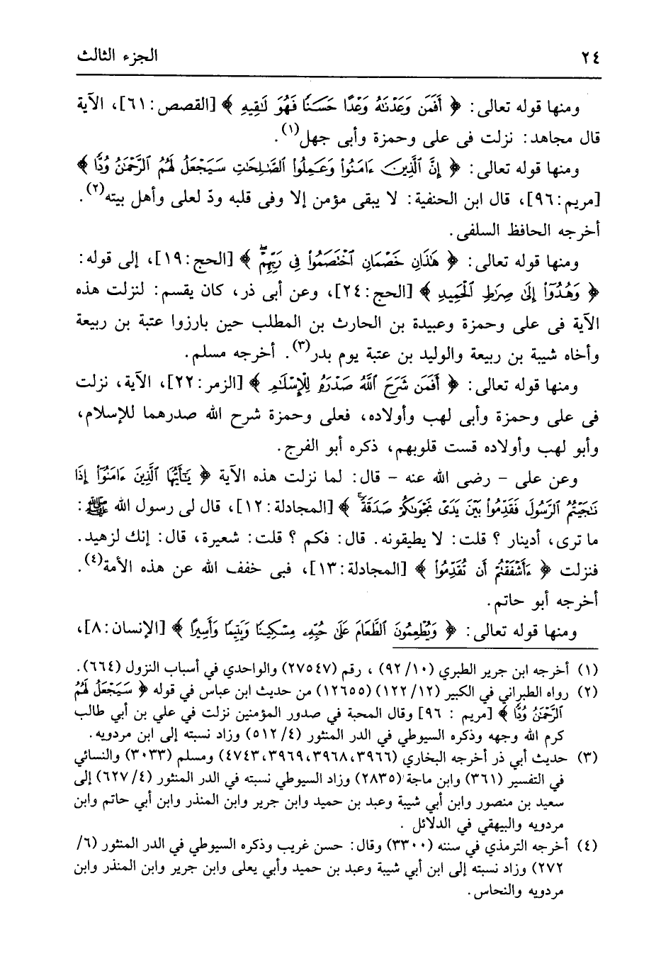 وَمِنْهَا قَوْله تَعَالَى {أفمنَ وَعدناه وَعداً حسنُاً فهَوَ لاقيهِ} الْقَصَص 61 الْآيَة قَالَ مُجَاهِد نزلت فِي عَليّ وَحَمْزَة وَأبي جهل وَمِنْه قَوْله تَعَالَى {إنَ اَلذَينَ آمَنُوا وَعَمِلُوا اَلصالِحاتِ سيَجعَلُ لهمُ الرَّحْمَن وُداً} مَرْيَم 96 قَالَ ابْن الحنيفة لَا يبْقى مُؤمن إِلَّا وَفِي قلبه ود لعَلي وَأهل بَيته أخرجه الْحَافِظ السلَفِي وَمِنْهَا قَوْله تَعَالَى {هذانِ خصمَانِ اختَصَمُوا فِي رَبّهِم} الْحَج 19 إِلَى قَوْله {وهدوا إِلَى صِرَاط الحميد} الْحَج 24 وَعَن أبي ذَر كَانَ يقسم لنزلت هَذِه الْآيَة فِي عَليّ وَحَمْزَة وَعبيدَة بن الْحَارِث بن الْمطلب حِين بارزوا عتبَة بن ربيعَة وأخاه شيبَة بن ربيعَة والوليد بن عتبَة يَوْم بدر أخرجه مُسلم وَمِنْهَا قَوْله تَعَالَى {أَفَمنَ شرح اللَهُ صَدرَه لِلإسلام} الزمر 22 الْآيَة نزلت فِي عَليّ وَحَمْزَة وَأبي لَهب وَأَوْلَاده فعلي وَحَمْزَة شرح الله صدرهما لِلْإِسْلَامِ وَأَبُو لَهب وَأَوْلَاده قست قُلُوبهم ذكره أَبُو الْفرج وَعَن عَليّ رَضِي الله عَنهُ قَالَ لما نزلت هَذِه الْآيَة {يَا أَيهَا الَذِينَ آمنَوُا إِذا نَاجَيْتُم اَلرَسُولَ فَقَدِّمُوا بَين يَدي نَجوَاكُمْ صَدَقَة} المجادلة 12 قَالَ لي رَسُول الله