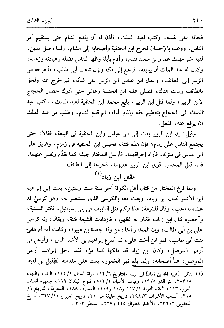 فخافه على نَفسه وَكتب لعبد الْملك فَأذن لَهُ أَن يقدم الشَّام حَتَّى يَسْتَقِيم أَمر النَّاس ووعده بِالْإِحْسَانِ فَخرج ابْن الْحَنَفِيَّة وَأَصْحَابه إِلَى الشَّام وَلما وصل مَدين لقِيه خبر مهلك عَمْرو بن سعيد فندم وَأقَام بأيلة وَظهر للنَّاس فَضله وعبادته وزهده وَكتب لَهُ عبد الْملك أَن يبايعه فَرجع إِلَى مَكَّة وَنزل شعب أبي طَالب فَأخْرجهُ ابْن الزبير إِلَى الطَّائِف وعذل ابْن عَبَّاس ابْن الزبير على شَأْنه ثمَّ خرج عَنهُ وَلحق بِالطَّائِف وَمَات هُنَاكَ فصلى عَلَيْهِ ابْن الْحَنَفِيَّة وعاش حَتَّى أدْرك حِصَار الْحجَّاج لِابْنِ الزبير وَلما قتل ابْن الزبير بَايع مُحَمَّد ابْن الْحَنَفِيَّة لعبد الْملك وَكتب عبد الْملك إِلَى الْحجَّاج بتعظيم حَقه وبَسطِ أمله ثمَّ قدم الشَّام وَطلب من عبد الْملك أَن يرفع عَنهُ ففْعل وَقيل إِن ابْن الزبير بعث إِلَى ابْن عَبَّاس وَابْن الْحَنَفِيَّة فِي الْبيعَة فَقَالَا حَتَّى يجْتَمع النَّاس على إِمَام فَإِن هَذِه فتْنَة فحبس ابْن الْحَنَفِيَّة فِي زَمْزَم وضيق على ابْن عَبَّاس فِي منزله فَأَرَادَ إحراقهما فَأرْسل الْمُخْتَار جَيْشه كَمَا تقدَّم وَنَفس عَنْهُمَا فَلَمَّا قتل الْمُخْتَار قوي ابْن الزبير عَلَيْهِمَا فَخَرَجَا إِلَى الطَّائِف