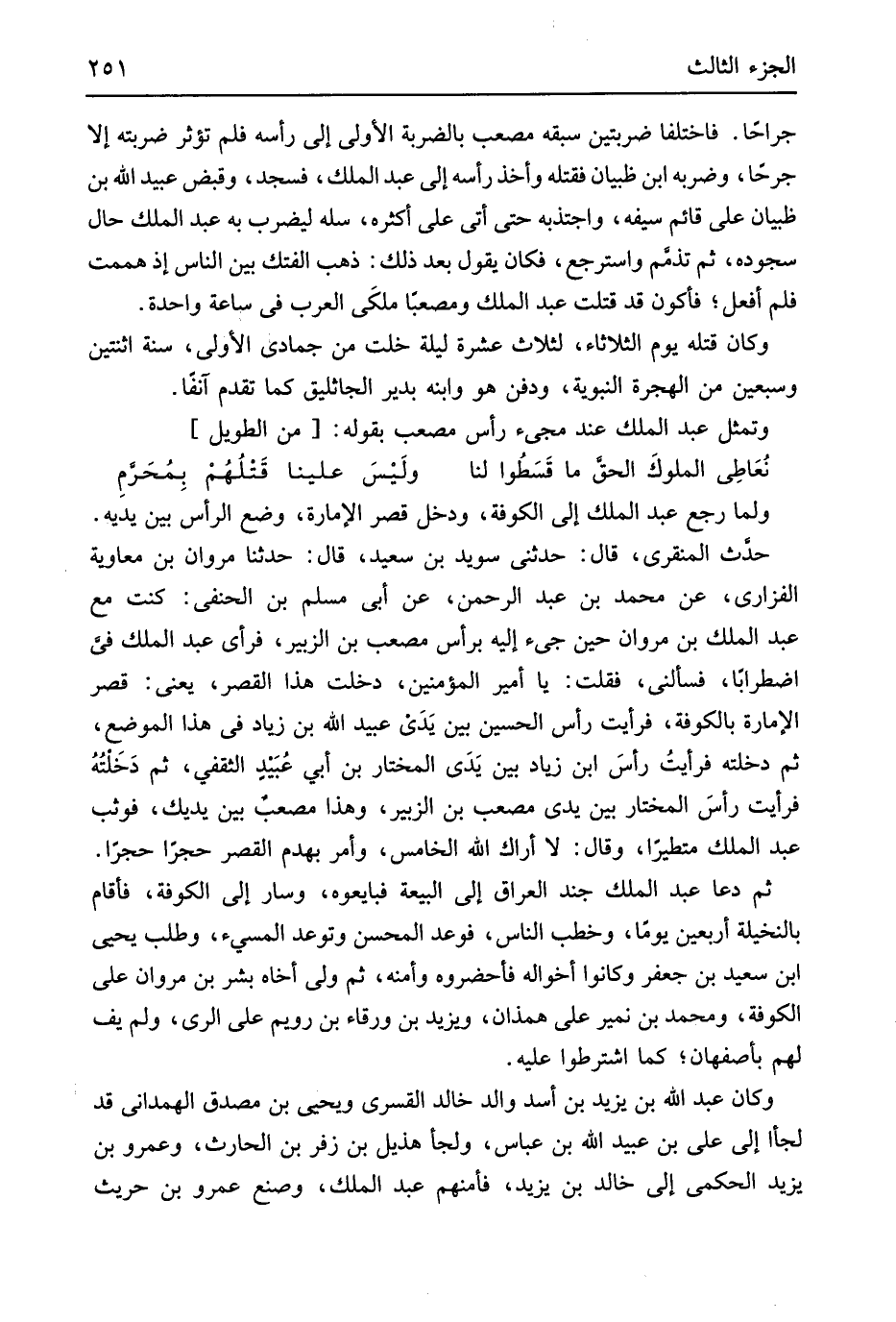 جراحاً فاختلفا ضربتين سبقه مُصعب بالضربة الأولى إِلَى رَأسه لم تُؤثر ضَربته إِلَّا جرحا وضربه ابْن ظبْيَان فَقتله وَأخذ رَأسه إِلَى عبد الْملك فَسجدَ وَقبض عبيد الله بن ظبْيَان على قَائِم سَيْفه واجتذبه حَتَّى آتى على أَكْثَره سَله ليضْرب بِهِ عبد الْملك حَال سُجُوده ثمَّ تذمم واسترجع فَكَانَ يَقُول بعد ذَلِك ذهب الفتك بَين النَّاس إِذْ هَمَمْت فَلم أفعل فَأَكُون قد قتلت عبد الْملك ومصعباً ملكَي الْعَرَب فِي سَاعَة وَاحِدَة وَكَانَ قَتله يَوْم الثُّلَاثَاء لثلاث عشرَة لَيْلَة خلت من جُمَادَى الأولى سنة اثْنَتَيْنِ وَسبعين من الْهِجْرَة النَّبَوِيَّة وَدفن هُوَ وَابْنه بدير الجاثليق كَمَا تقدم آنِفا وتمثل عبد الْملك عِنْد مَجِيء رَأس مُصعب بقوله من // (الطَّوِيل) //