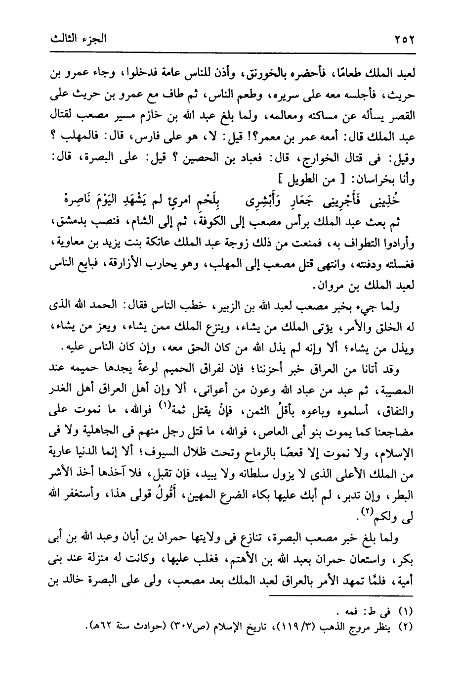 لعبد الْملك طَعَاما فَأحْضرهُ بالخورنق وَأذن للنَّاس عَامَّة فَدَخَلُوا وَجَاء عمر بن حُرَيْث فأجلسه مَعَه على سَرِيره وَطعم النَّاس ثمَّ طَاف مَعَ عَمْرو بن حُرَيْث على الْقصر يسْأَله عَن مساكنه ومعالمه وَلما بلغ عبد الله بن خازم مسير مُصعب لقِتَال عبد الْملك قَالَ أمعه عمر بن معمر قيل لَا هُوَ على فَارس قَالَ فالمهلب وَقيل فِي قتال الْخَوَارِج قَالَ فَعبَّاد بن الْحصين قيل على الْبَصْرَة قَالَ وَأَنا بخرسان من // (الطَّوِيل) //