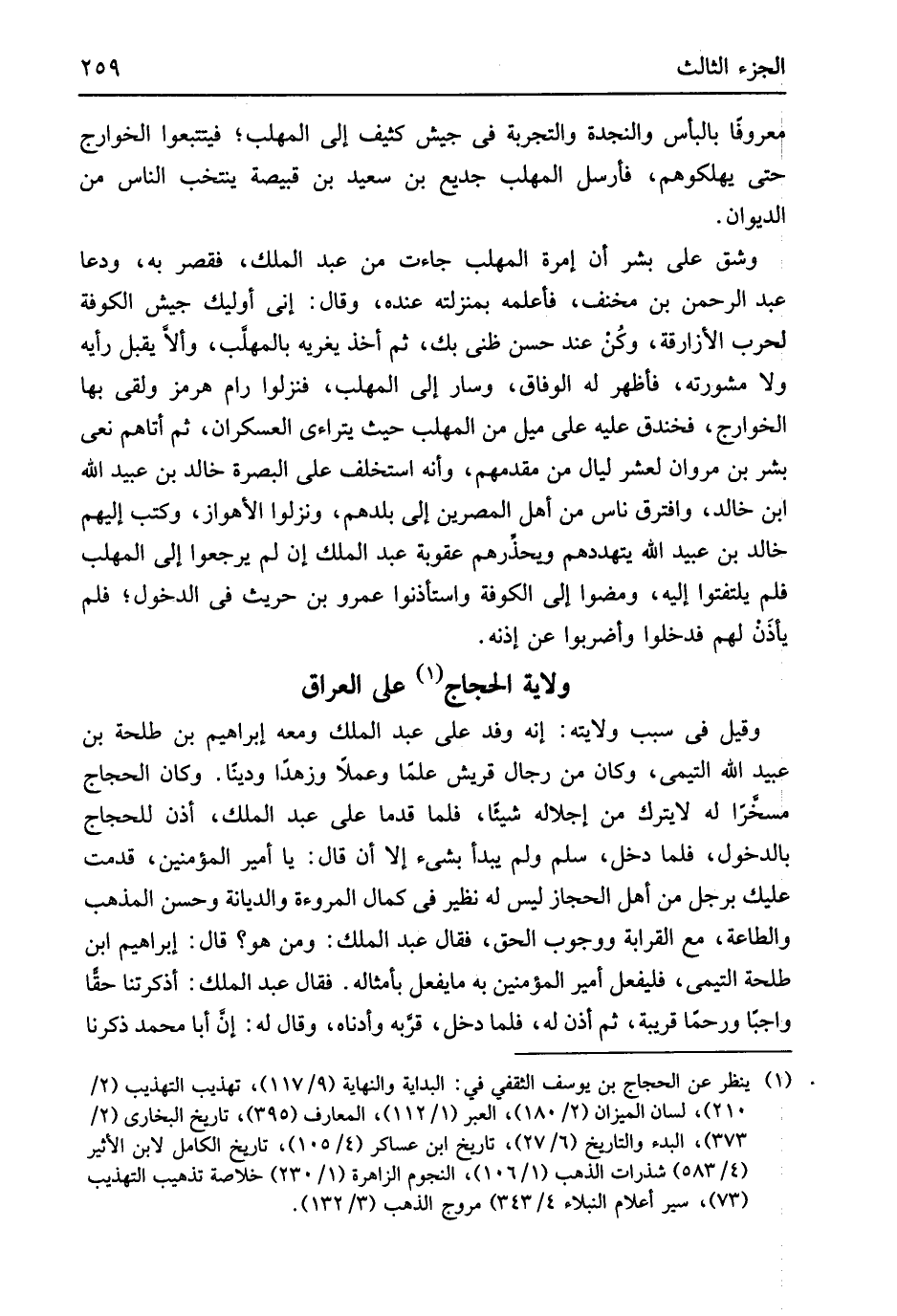 مَعْرُوفا بالبأس والنجدة والتجربة فِي جَيش كثيف إِلَى الْمُهلب فيتتبعوا الْخَوَارِج حَتَّى يهلكوهم فَأرْسل الْمُهلب جديع بن سعيد بن قبيصَة ينتخب النَّاس من الدِّيوَان وشق على بشر أَن إمرة الْمُهلب جَاءَت من عبد الْملك فقصر بِهِ ودعا عبد الرَّحْمَن بن مخنف فَأعلمهُ بِمَنْزِلَتِهِ عِنْده وَقَالَ إِنِّي أوليك جَيش الْكُوفَة لِحَرْب الْأزَارِقَة وكُن عِنْد حسن ظَنِّي بك ثمَّ أَخذ يغريه بالمهلَب وَألا يقبل رَأْيه وَلَا مشورته فأظهر لَهُ الْوِفَاق وَسَار إِلَى الْمُهلب فنزلوا رام هُرْمُز وَلَقي بهَا الْخَوَارِج فَخَنْدَق عَلَيْهِ على ميل من الْمُهلب حَيْثُ يتَرَاءَى العسكران ثمَّ أَتَاهُم نعي بشر بن مَرْوَان لعشر لَيَال من مقدمهم وَأَنه اسْتخْلف على الْبَصْرَة خَالِد بن عبيد الله ابْن خَالِد وافترق نَاس من أهل المصرين إِلَى بلدهم ونزلوا أهواز وَكتب إِلَيْهِم خَالِد بن عبيد الله يتهددهم ويحذرهم عُقُوبَة عبد الْملك إِن لم يرجِعوا إِلَى الْمُهلب فَلم يلتفتوا إِلَيْهِ ومضوا إِلَى الْكُوفَة وَاسْتَأْذَنُوا عَمْرو بن حُرَيْث فِي الدُّخُول فَلم يَأْذَن لَهُم دخلُوا وأضربوا عَن إِذْنه