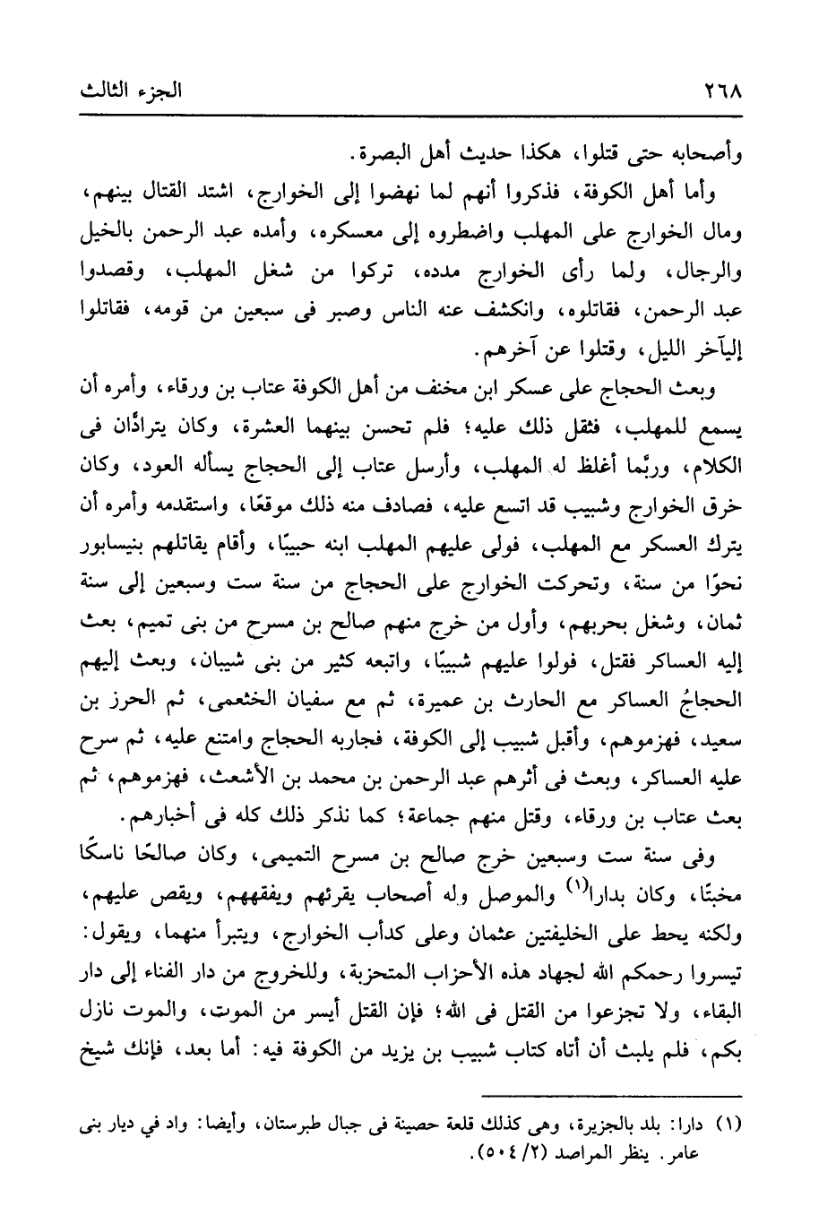 وَأَصْحَابه حَتَّى قتلوا هَكَذَا حَدِيث أهل الْبَصْرَة وَأما أهل الْكُوفَة فَذكرُوا أَنهم لما نهضوا إِلَى الْخَوَارِج اشْتَدَّ الْقِتَال بَينهم وَمَال الْخَوَارِج على الْمُهلب واضطروه لى مُعَسْكَره وأمده عبد الرَّحْمَن بِالْخَيْلِ وَالرِّجَال وَلما رأى الْخَوَارِج مدده تركُوا من شغل الْمُهلب وقصدوا عبد الرَّحْمَن فقاتلوه وانكشف عَنهُ النَّاس وصبر فِي سبعين من قومه فَقَاتلُوا إليآخر اللَّيْل وَقتلُوا عَن آخِرهم وَبعث الْحجَّاج على عَسْكَر ابْن مخنف من أهل الْكُوفَة عتاب بن وَرْقَاء وَأمره أَن يسمع للمهلب فثقل ذَلِك عَلَيْهِ فَلم تحسن بَينهمَا الْعشْرَة وَكَانَ رترادان فِي الْكَلَام وَرُبمَا أغْلظ لَهُ الْمُهلب وَأرْسل عتاب إِلَى الْحجَّاج يسْأَله الْعود وَكَانَ خرق الْخَوَارِج وشبيب وَقد اتَّسع عَلَيْهِ فصادف مِنْهُ ذَلِك موقعَاً واستقدمه وَأمره أَن يتْرك الْعَسْكَر مَعَ الْمُهلب فولى عَلَيْهِم الْمُهلب ابْنه حبيباً وَأقَام يقاتلهم بنيسابور نَحوا من سنة وتحركت الْخَوَارِج على الْحجَّاج من سنة سِتّ وَسبعين إِلَى سنة ثَمَان وشغل بِحَرْبِهِمْ وَأول من خرج مِنْهُم صَالح بن مسرح من بني تَمِيم بعث إِلَيْهِ العساكر فَقتل فَوَلوا عَلَيْهِم شبيبا وَبعث وَأتبعهُ كثير من بني شَيبَان إِلَيْهِم الحجاجُ العساكر مَعَ الْحَارِث بن عميرَة ثمَّ مَعَ سُفْيَان الْخَثْعَمِي ثمَّ الْحِرْز بن سعيد فهزموهم وَأَقْبل شبيب إِلَى الْكُوفَة فجار بِهِ الْحجَّاج وَامْتنع عَلَيْهِ ثمَّ سرح عَلَيْهِ العساكر وَبعث فِي أَثَرهم عبد الرَّحْمَن بن مُحَمَّد بن الْأَشْعَث فهزموهم ثمَّ بعث عتاب بن وَرْقَاء وَقتل مِنْهُم جمَاعَة كَمَا نذْكر ذَلِك كُله ي أخبارهم وف سنة سِتّ وَسبعين خرج صَالح بن مسرح التَّمِيمِي وَكَانَ صَالحا ناسكاً مخبتاً وَكَانَ بدارا والموصل وَله أَصْحَاب يُقْرِئهُمْ ويفقههم ويقص عَلَيْهِم وَلكنه يحط على الخليفتين عُثْمَان وَعلي كدأب الْخَوَارِج ويتبرأ مِنْهُمَا وَيَقُول تيسروا رحمكم الله لجهاد هَذِه الْأَحْزَاب المتحزبة وللخروج من دَار الفناء إِلَى دَار الْبَقَاء وَلَا تجزعوا من الْقَتْل فِي الله فَإِن الْقَتْل أيسر من الْمَوْت وَالْمَوْت نَازل بكم لم يلبث أَن أَتَاهُ كتاب شبيب بن يزِيد من الْكُوفَة فِيهِ أما بعد فَإنَّك شيخ