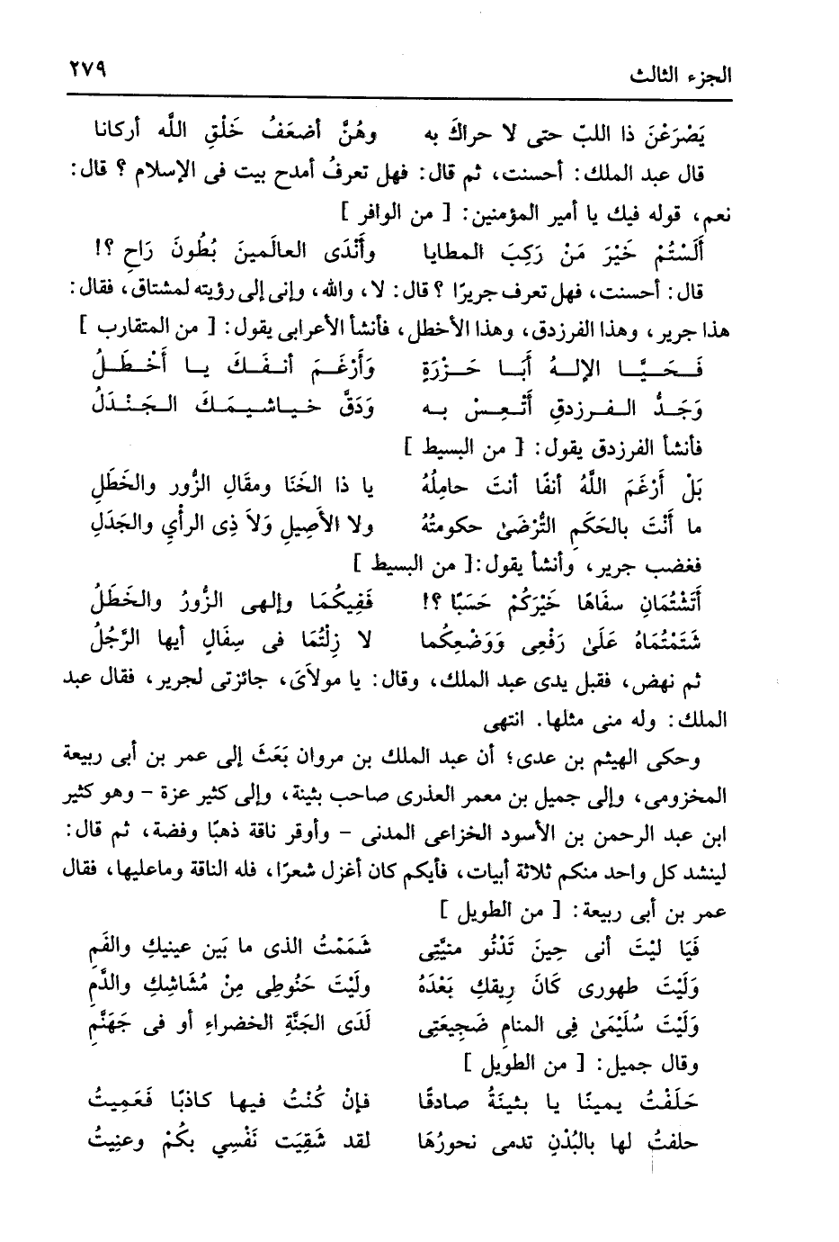 ثمَّ نَهَضَ فَقيل يَدي عبد الْملك وَقَالَ يَا مولاَيَ جائزتي لجرير فَقَالَ عبد الْملك وَله مني مثلهَا انْتهى وَحكى الْهَيْثَم بن عدي أَن عبد الْملك بن مَرْوَان بَعَثَ إِلَى عمر بن أبي ربيعَة المَخْزُومِي وَإِلَى جميل بن معمر العذري صَاحب بثينة وَإِلَى كثير عزة وَهُوَ كثير ابْن عبد الرَّحْمَن بن الْأسود الْخُزَاعِيّ الْمدنِي وأوقر نَاقَة ذهبَاً وَفِضة ثمَّ قَالَ لينشد كل وَاحِد مِنْكُم ثَلَاثَة أَبْيَات فَأَيكُمْ كَانَ أغزل شعرَاً فَلهُ النَّاقة وَمَا عَلَيْهَا فَقَالَ عمر بن أبي ربيعَة // (من الطَّوِيل) //