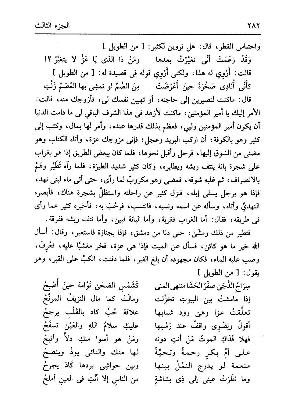 قَالَ ماكنت لتصرين لى حَاجته أَو تهبين نَفسك لي فأزوجك مِنْهُ قَالَت الْأَمر إِلَيْك يَا أَمِير الْمُؤمنِينَ مَا كنت لأزهد فِي هَذَا الشّرف الْبَاقِي لي مَا دَامَت الدُّنْيَا أَن يكون أَمِير الْمُؤمنِينَ وليي فَعظم بذلك قدرهَا عِنْده وَأمر لَهَا بِمَال وَكتب إِلَى كثير وَهُوَ بِالْكُوفَةِ أَن اركب الْبَرِيد وَعجل فَإِنِّي مزوجك عزة وَأَتَاهُ الْكتاب وَهُوَ مضني من الشوق إِلَيْهَا فَرَحل وَأَقْبل نَحْوهَا فَلَمَّا كَانَ بِبَعْض الطَّرِيق إِذا هُوَ بغراب على شَجَرَة بانة ينتف ريشه ويطايره وَكَانَ كثير شَدِيد الطيرَة فَلَمَّا رَآهُ تَطَير وهَم بالانصراف ثمَّ غَلبه شوقه فَمضى وَهُوَ مكروب لما رأى حَتَّى آتى مَاء لبني نهد فَإِذا هُوَ بِرَجُل يسْقِي إبِله فَنزل كثير عَن رَاحِلَته واستظل بشجرة هُنَاكَ فَأَبْصَرَهُ النَّهْدِيّ وَأَتَاهُ وَسَأَلَهُ عَن اسْمه وَنسبه فانتسب فرحبَ بِهِ فَأخْبرهُ كثير عَمَّا رأى فِي طَرِيقه فَقَالَ أما الْغُرَاب فغربة وَأما البانة فَبين وَأما نتف ريشه ففرقة فتطير من ذَلِك ومشَى حَتَّى دنا من دمشق فَإِذا بِجنَازَة فاستعبر وَقَالَ أسأَل الله خير مَا هُوَ كَائِن فَسَأَلَ عَن الْمَيِّت فَإِذا هِيَ عزة فَخر مغشياً عَلَيْهِ فعُرِفَ وصب عَلَيْهِ المَاء فَكَانَ مجهوده أَن بلغ الْقَبْر فَلَمَّا دفنت انكب على الْقَبْر وَهُوَ يَقُول // (من الطَّوِيل) //