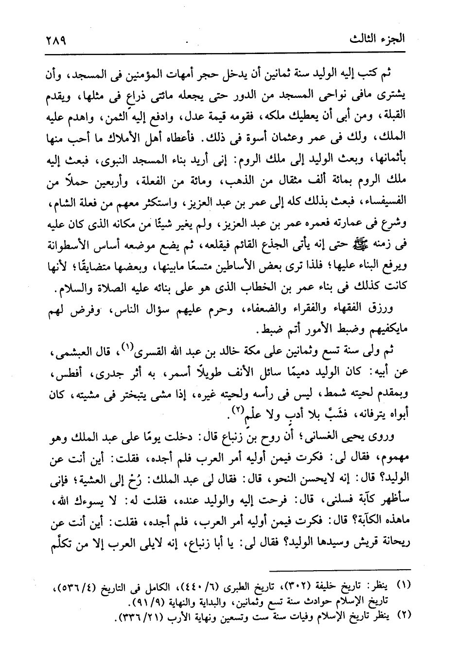 حَتَّى إِنَّه يَأْتِي الْجذع الْقَائِم فيقلعه ثمَّ يضع مَوْضِعه أساس الأسطوانة وَيرْفَع الْبناء عَلَيْهَا فَلِذَا ترى بعض الأساطين متسعاً مَا بَينهَا وَبَعضهَا متضايقاً لِأَنَّهَا كَانَت كَذَلِك فِي بِنَاء عمر بن الْخطاب الَّذِي هُوَ على بنائِهِ عَلَيْهِ الصَّلَاة وَالسَّلَام ورزق الْفُقَهَاء والفقراء والضعفاء وَحرم عَلَيْهِم سُؤال النَّاس وَفرض لَهُم مَا يكفيهم وَضبط الْأُمُور أتم ضبط ثمَّ ولى سنة تسع وَثَمَانِينَ على مَكَّة خَالِد بن عبد الله الْقَسرِي قَالَ العبشمي عَن أَبِيه كَانَ الْوَلِيد دميماً سَائل الْأنف طويلاَ أسمر بِهِ أثر جدري أفطس وبمقدم لحيته شمط لَيْسَ فِي رَأسه ولحيته غَيره إِذا مَشى يتبختر فِي مشيته كَانَ أَبَوَاهُ يترفانه فشب بِلَا أدب وَلَا علم وروى يحيى الغساني أَن روح بن زنباغ قَالَ دخلت يَوْمًا على عبد الْملك وَهُوَ مهموم فَقَالَ لي فَكرت فِيمَن أوليه أَمر الْعَرَب فَلم أَجِدهُ فَقلت أَيْن أَنْت عَن الْوَلِيد قَالَ إِنَّه لَا يحسن النَّحْو قَالَ فَقَالَ لي عبد الْملك رُح إِلَى العشية فَإِنِّي سأظهر كآبة فسلني قَالَ فرحت إِلَيْهِ والوليد عِنْده فَقلت لَهُ لَا يسوءك الله مَا هَذِه الكآبة قَالَ فَكرت فِيمَن أوليه أَمر الْعَرَب فَلم أَجِدهُ فَقلت أَيْن أَنْت عَن رَيْحَانَة قُرَيْش وسيدها الْوَلِيد فَقَالَ لي يَا أَبَا زنباع إِنَّه لَا يَلِي الْعَرَب إِلَّا من تكلم