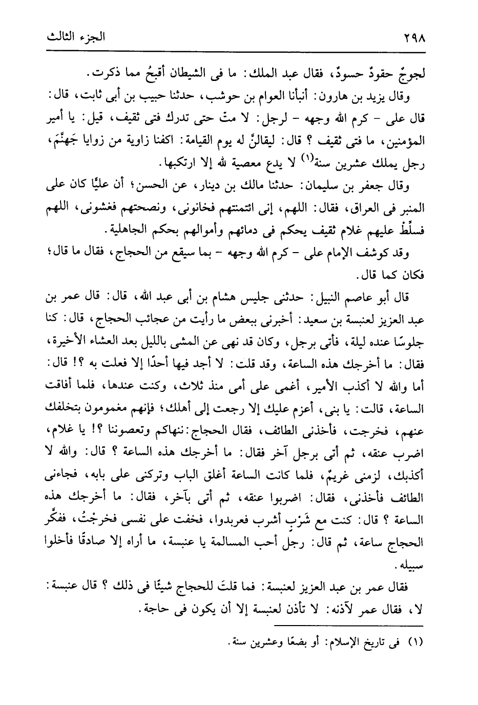 لجوج حقود حسودٌ فَقَالَ عبد الْملك مَا فِي الشَّيْطَان أقبحُ مِمَّا ذكرت وَقَالَ يزِيد بن هَارُون أَنبأَنَا الْعَوام بن حَوْشَب حَدثنَا حبيب بن أبي ثَابت قَالَ قَالَ عَليّ كرم الله وَجهه لرجل لَا مت حَتَّى تدْرك فَتى ثَقِيف قيل يَا أَمِير الْمُؤمنِينَ مَا فَتى ثَقِيف قَالَ ليقالن لَهُ يَوْم الْقِيَامَة اكْفِنَا زَاوِيَة من زَوَايَا جَهنمَ رجل يملك عشْرين سنة لَا يدع مَعْصِيّة لله إِلَّا ارتكبها وَقَالَ جَعْفَر بن سُلَيْمَان حَدثنَا مَالك بن دِينَار عَن الْحسن أَن عليا كَانَ على الْمِنْبَر فِي الْعرَاق فَقَالَ اللَّهُمَّ إِنِّي ائتمنتهم فأخذوني ونصحتهم فغشوني اللَّهُمَّ فَسلط عَلَيْهِم غُلَام ثَقِيف يحكم فِي دِمَائِهِمْ وَأَمْوَالهمْ بِحكم الْجَاهِلِيَّة وَقد كوشف الإِمَام عَليّ كرم الله وَجهه بِمَا سيقع من الْحجَّاج فَقَالَ مَا قَالَ فَكَانَ كَمَا قَالَ قَالَ أَبُو عَاصِم النَّبِيل حَدثنِي جليس هِشَام بن أبي عبد الله قَالَ قَالَ عَمْرو بن عبد الْعَزِيز لعنبسة بن سعيد أخبرنى بِبَعْض مَا رَأَيْت من عجائب الْحجَّاج قَالَ كُنَّا جُلُوسًا عِنْده لَيْلَة فَأتى بِرَجُل وَكَانَ قد نهى عَن الْمَشْي بِاللَّيْلِ بعد الْعشَاء الأخبره فَقَالَ مَا أخرجك هَذِه السَّاعَة وَقد قلت لَا أجد فِيهَا أحدا إِلَّا فعلت بِهِ قَالَ أما وَالله لَا أكذب الْأَمِير أُغمي على أُمِّي مُنْذُ ثَلَاث وَكنت عِنْدهَا فَلَمَّا أفاقت السَّاعَة قَالَت يَا بني أعزم عَلَيْك إِلَّا رجعت إِلَى أهلك فَإِنَّهُم مغمومون بتخلفك عَنْهُم فَخرجت فأخذني الطَّائِف فَقَالَ الْحجَّاج ننهاكم وتعصوننا يَا غُلَام اضْرِب عُنُقه ثمَّ أَتَى بِرَجُل آخر فَقَالَ مَا أخرجك هَذِه السَّاعَة قَالَ وَالله لَا أكذبك لزمني غَرِيم لما كَانَت السَّاعَة أغلق الْبَاب وَتَرَكَنِي على بَابه فجائني الطَّائِف فأخذني فَقَالَ اضربوا عُنُقه ثمَّ أَتَى بآخر فَقَالَ مَا أخرجك هَذِه السَّاعَة قَالَ كنت مَعَ شَرب أشْرب فعربدوا فَخفت على نَفسِي فخرجْتُ ففكَر الْحجَّاج سَاعَة ثمَّ قَالَ رجل أحب المسالمة يَا عَنْبَسَة مَا أرَاهُ إِلَّا صَادِقا فأخلوا سَبيله فَقَالَ عمر بن عبد الْعَزِيز لعنبسة فَمَا قلت للحجاج شَيْء فِي ذَلِك قَالَ عَنْبَسَة لَا فَقَالَ عمر لآذنه لَا تَأذن لعنبسة إِلَّا أَن يكون فِي حَاجَة