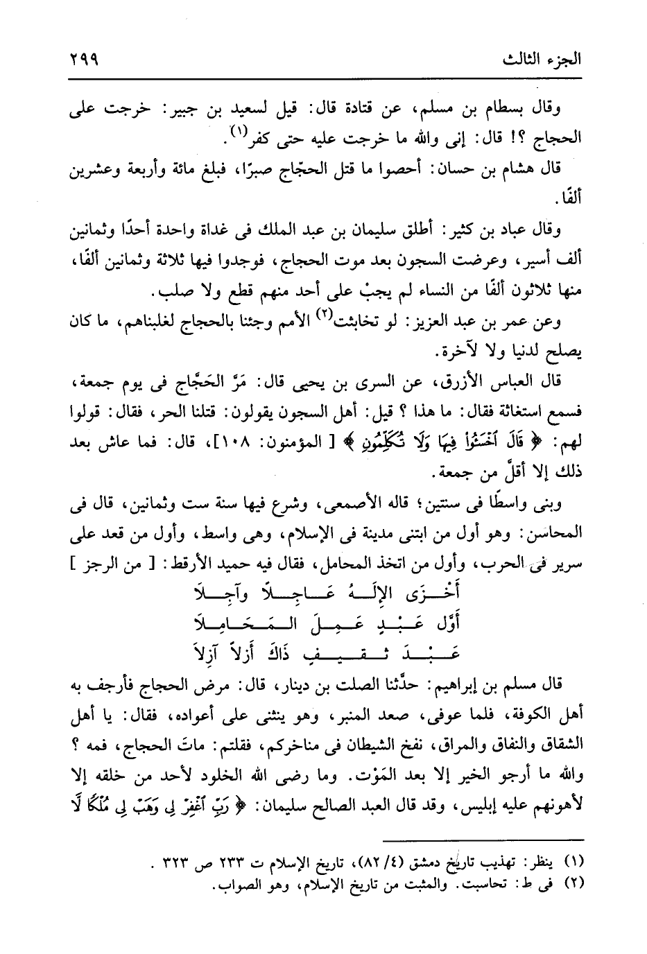 وَقَالَ بسطَام بن مُسلم عَن قَتَادَة قَالَ قيل لسَعِيد بن حبير خرجت على الْحجَّاج قَالَ إِنِّي وَالله مَا خرجت عَلَيْهِ حَتَّى كفر قَالَ هِشَام بن حسان أحصوا مَا قتل الْحجَّاج صبرا فَبلغ مائَة وَأَرْبَعَة وَعشْرين ألفا وَقَالَ عبَادَة بن كثير أطلق سُلَيْمَان عبد الْملك فِي عذاة وَاحِدَة أحدا وَثَمَانِينَ ألف أَسِير وَعرضت السجون بعد موت الْحجَّاج فَوجدَ فِيهَا ثَلَاثَة وَثَمَانِينَ ألفا مِنْهَا ثَلَاثُونَ ألفا من النِّسَاء لم يجب على أحد مِنْهُم قطع وَلَا صلب وَعَن عمر بن عبد الْعَزِيز لَو تخابثت الْأُمَم وَجِئْنَا بالحجاج لغلبناهم مَا كَانَ يصلح لدُنْيَا وَلَا لآخرة قَالَ الْعَبَّاس الْأَزْرَق عَن السّري بن يحيى قَالَ مَر الحَجاج فِي يَوْم جُمُعَة فَسمع استغاثة فَقَالَ مَا هَذَا قيل أهل السجون يَقُولُونَ قتلنَا الْحر فَقَالَ قُولُوا لَهُم {قَالَ اَخسئوُا فِيهَا وَلا تُكلِمُونِ} الْمُؤْمِنُونَ 108 قَالَ فَمَا عَاشَ بعد ذَلِك إِلَّا أقل من جُمُعَة وَبنى واسطاً فِي سنتَيْن قَالَه الْأَصْمَعِي وَشرع فِيهَا سنة سِتّ وَثَمَانِينَ قَالَ فِي المحاسن وَهُوَ أول من ابتنى مَدِينَة فِي الْإِسْلَام وَهِي وَاسِط وَأول من قعد على سَرِير فِي الْحَرْب وَأول من اتخذ بالمحامل فَقَالَ فِيهِ حميد الأرقط // (من الرجز) //