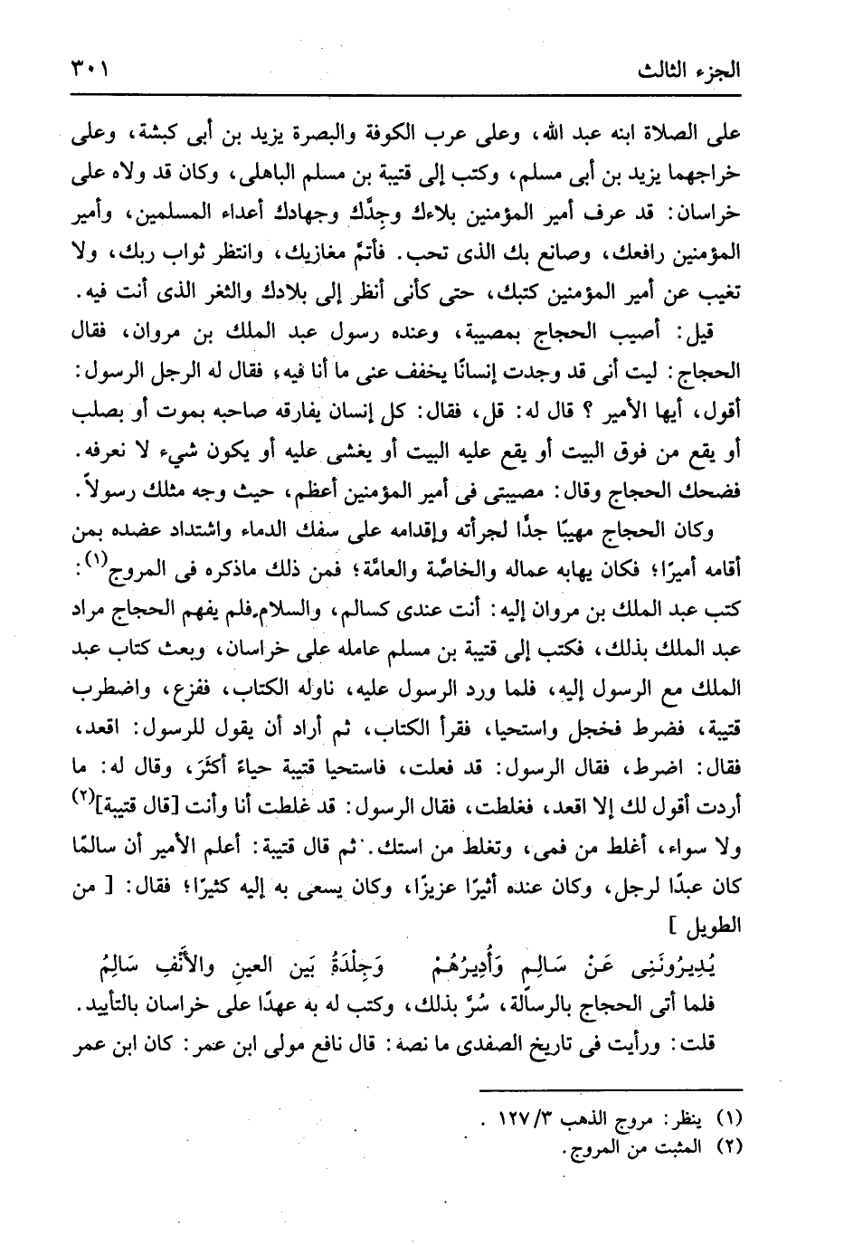 على الصَّلَاة ابْنه عبد الله وعَلى عرب الْكُوفَة وَالْبَصْرَة يزِيد بن أبي كَبْشَة وعَلى خراجهما يزِيد بن أبي مُسلم وَكتب إِلَى قُتَيْبَة بن مُسلم الْبَاهِلِيّ وَكَانَ قد ولاه على خُرَاسَان قد عرف أَمِير الْمُؤمنِينَ بلاءك وجِدك وجهادك أَعدَاء الْمُسلمين وأمير الْمُؤمنِينَ رافعك وصانع بك الَّذِي تحب فأتمَّ مغازيك وانتظر ثَوَاب رَبك وَلَا تغيب عَن أَمِير الْمُؤمنِينَ كتبك حَتَّى كَأَنِّي أنظر إِلَى بلادك والثغر الَّذِي أَنْت فِيهِ قيل أُصِيب الْحجَّاج بمصيبة وَعِنْده رَسُول عبد الْملك بن مَرْوَان فَقَالَ الْحجَّاج لَيْت أَنِّي قد وجدت إنْسَانا يُخَفف عني مَا أَنا فِيهِ فَقَالَ لَهُ الرجل الرَّسُول أَقُول أَيهَا الْأَمِير قَالَ لَهُ قل فَقَالَ كل إِنْسَان يُفَارِقهُ صَاحبه بِمَوْت أَو بصلب أَو يَقع من فَوق الْبَيْت أَو يَقع عَلَيْهِ الْبَيْت أَو يغشى عَلَيْهِ أَو يكون شَيْء لَا نعرفه فَضَحِك الْحجَّاج وَقَالَ مصيبتي فِي أَمِير الْمُؤمنِينَ أعظم حَيْثُ وَجه مثلك رَسُولا وَكَانَ الْحجَّاج مهيباً جدا لجرأته وإقدامه على سفك الدِّمَاء واشتداد عضده بِمن أَقَامَهُ أَمِيرا فَكَانَ يهابه عماله والخاصة والعامة فَمن ذَلِك مَا ذكره فِي المروج كتب عبد الْملك بن مَرْوَان إِلَيْهِ أَنْت عِنْدِي كسالم وَالسَّلَام فَلم يفهم الْحجَّاج مُرَاد عبد الْملك بذلك فَكتب إِلَيْهِ قُتَيْبَة بن مُسلم عَامله على خُرَاسَان وَبعث كتاب عبد الْملك مَعَ الرَّسُول إِلَيْهِ فَلَمَّا ورد الرَّسُول عَلَيْهِ نَاوَلَهُ الْكتاب فَفَزعَ واضطرب قُتَيْبَة فضرط فَخَجِلَ واستحيا فَقَرَأَ الْكتاب ثمَّ أَرَادَ أَن يَقُول للرسول اقعد فَقَالَ اضرط فَقَالَ الرَّسُول قد فعلت فاستحيا قُتَيْبَة حَيَاء أكثَرَ وَقَالَ لَهُ مَا أردْت أَقُول لَك إِلَّا اقعد فغلطت فَقَالَ الرَّسُول قد غَلطت أَنا وَأَنت قَالَ قُتَيْبَة وَلَا سَوَاء أغلط من فمي وتغلط من استك ثمَّ قَالَ قُتَيْبَة أعلم الْأَمِير أَن سالما كَانَ عبدا لرجل وَكَانَ عِنْده أثيراً عَزِيزًا وَكَانَ يسْعَى بِهِ إِلَيْهِ كثيرا فَقَالَ من // (الطَّوِيل) //