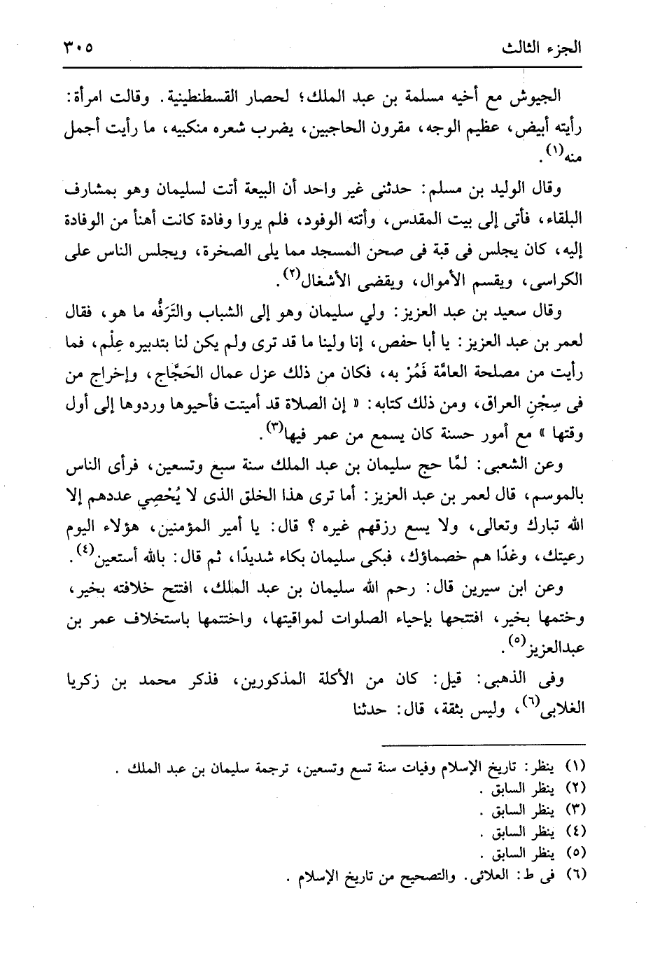 الجيوش مَعَ أَخِيه مسلمة بن عبد الْملك لحصار الْقُسْطَنْطِينِيَّة وَقَالَ امْرَأَة رَأَيْته أَبيض عَظِيم الْوَجْه مقرون الحاجبين يضْرب شعره مَنْكِبَيْه مَا رَأَيْت أجمل مِنْهُ وَقَالَ الْوَلِيد بن مُسلم حَدثنِي غير وَاحِد أَن الْبيعَة أَتَت لِسُلَيْمَان وَهُوَ بمشارف البلقاء فَأنى إِلَى الْبَيْت الْمُقَدّس وأتته الْوُفُود فَلم يرَوا وفادة كَانَت أهنأ من الْوِفَادَة إِلَيْهِ كَانَ يجلس فِي قبَّة فِي صحن الْمَسْجِد مِمَّا يَلِي الصَّخْرَة وَيجْلس النَّاس على الكراسي وَيقسم الْأَمْوَال وَيَقْضِي الأشغال وَقَالَ سعيد بن عبد الْعَزِيز ولي سُلَيْمَان وَهُوَ إِلَى الشَّبَاب والتَرَفه مَا هُوَ فَقَالَ لعمر بن عبد الْعَزِيز يَا أَبَا حَفْص إِنَّا ولينا مَا قد ترى وَلم يكن لنا بتدبيره عِلْم فَمَا رَأَيْت من مصلحَة الْعَامَّة فَمُر بِهِ فَكَانَ من ذَلِك عزل عُمَّال الحَجاج وَإِخْرَاج من فِي سِجْنِ الْعرَاق وَمن ذَلِك كِتَابه إِن الصَّلَاة قد أميتت فأحيوها وردوها إِلَى أول وَقتهَا مَعَ أُمُور حَسَنَة كَانَ يسمع من عمر فِيهَا وَعَن الشّعبِيّ لما حج سُلَيْمَان بن عبد الْملك سنة سبع وَتِسْعين فَرَأى النَّاس بِالْمَوْسِمِ قَالَ لعمر بن عبد الْعَزِيز أما ترى هَذَا الْخلق الَّذِي لَا يُحصِي عَددهمْ إِلَّا الله تبَارك وَتَعَالَى وَلَا يسع رزقهم غَيره قَالَ يَا أَمِير الْمُؤمنِينَ هَؤُلَاءِ الْيَوْم رعيتك وَغدا هم خصماؤك فَبكى سُلَيْمَان بكاء شَدِيدا ثمَّ قَالَ بِاللَّه أستعين وَعَن ابْن سِيرِين قَالَ رحم الله سُلَيْمَان بن عبد الْملك افْتتح خِلَافَته بِخَير وختمها بِخَير افتتحها بإحياء الصَّلَوَات لمواقيتها واختتمها باستخلاف عمر بن عبد الْعَزِيز وَفِي الذَّهَبِيّ قيل كَانَ من الْأكلَة الْمَذْكُورين فَذكر مُحَمَّد بن زَكَرِيَّا الْغلابِي وَلَيْسَ بِثِقَة قَالَ حَدثنَا