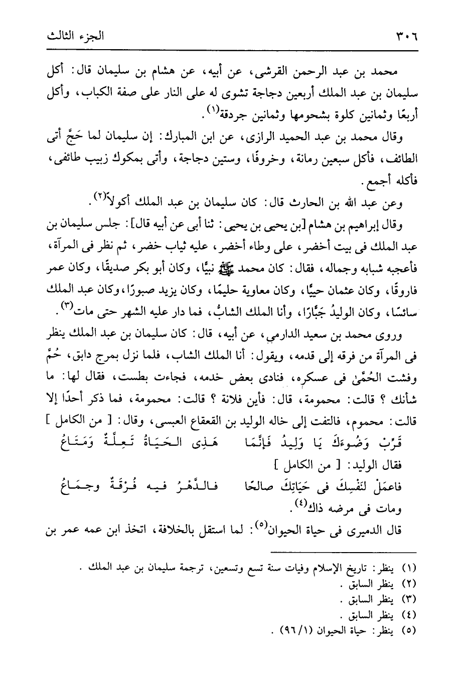 مُحَمَّد بن عبد الرَّحْمَن القرش عَن أَبِيه عَن هِشَام بن سُلَيْمَان قَالَ أكل سُلَيْمَان بن عبد الْملك أَرْبَعِينَ دجَاجَة تشوى لَهُ على النَّار على صفة الكباب وَأكل أَرْبعا وَثَمَانِينَ كلوة بشحومها وَثَمَانِينَ جردقة وَقَالَ مُحَمَّد بن عبد الحميد الرَّازِيّ عَن ابْن الْمُبَارك إِن سُلَيْمَان لما حج آتى الطَّائِف فَأكل سبعين رمانة وخروفاً وَسِتِّينَ دجَاجَة وأتى بموكب زبيب طائفي فَأَكله أجمع وَعَن عبد الله بن الْحَارِث قَالَ كَانَ سُلَيْمَان بن عبد الْملك أكولا وَقَالَ إِبْرَاهِيم بن هِشَام بن يحيى بن يحيى ثَنَا أبي عَن أَبِيه قَالَ جلس سُلَيْمَان بن عبد الْملك فِي بَيت أَخْضَر على وطاء أَخْضَر عَلَيْهِ ثِيَاب خضر ثمَّ نظر فِي الْمرْآة فأعجبه شبابه وجماله فَقَالَ كَانَ مُحَمَّد