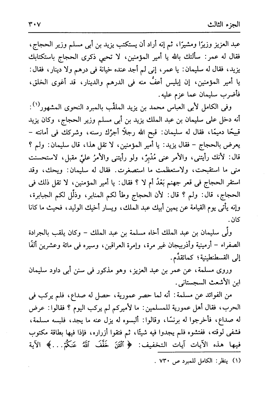 عبد الْعَزِيز وزيراً ومشيراً ثمَّ إِنَّه أَرَادَ أَن يسْتَكْتب يزِيد بن أبي مُسلم وَزِير الْحجَّاج فَقَالَ لَهُ عمر سَأَلتك بِاللَّه يَا أَمِير الْمُؤمنِينَ لَا تحيي ذكرى الْحجَّاج باستكتابك يزِيد فَقَالَ لَهُ سُلَيْمَان يَا عمر إِنِّي لم أجد عِنْده خِيَانَة فِي دِرْهَم وَلَا دِينَار فَقَالَ يَا أَمِير الْمُؤمنِينَ إِن إِبْلِيس أعف مِنْهُ فِي الدِّرْهَم وَالدَّنَانِير قد أغوى الْخلق فَأَضْرب سُلَيْمَان عَمَّا عزم عَلَيْهِ وَفِي الْكَامِل لأبي الْعَبَّاس مُحَمَّد بن يزِيد الملقب بالمبرد النَّحْوِيّ الْمَشْهُور أَنه دخل على سُلَيْمَان بن عبد الْملك يزِيد بن أبي مُسلم وَزِير الْحجَّاج وَكَانَ يزِيد قبيحاً دميما فَقَالَ لَهُ سلمَان قبح الله رجلا أجرَك رسنه وشركك فِي أَمَانَته يعرض بالحجاج فَقَالَ يزِيد يَا أَمِير الْمُؤمنِينَ لَا تقل هَذَا قَالَ سُلَيْمَان وَلم قَالَ لِأَنَّك رَأَيْتنِي وَالْأَمر عني مُدْبِر وَلَو رَأَيْتنِي والأمرُ عليَّ مقبل لاستحسنت مني مَا استقبحت ولاستعظمت مَا استصغرت فَقَالَ لَهُ سُلَيْمَان وَيحك وَقد اسْتَقر الْحجَّاج فِي قَعْر جَهَنَّم بَعْدُ أم لَا فَقَالَ يَا أَمِير الْمُؤمنِينَ لَا تقل ذَلِك فِي الْحجَّاج قَالَ وَلم قَالَ لِأَن الْحجَّاج وطأ لكم المنابر وذلَل لكم الْجَبَابِرَة وَإنَّهُ يَأْتِي يَوْم الْقِيَامَة عَن يَمِين أَبِيك عبد الْملك ويسار أَخِيك الْوَلِيد فَحَيْثُ مَا كَانَا كَانَ ولى سُلَيْمَان بن عبد الْملك أَخَاهُ مسلمة بن عبد الْملك وَكَانَ يلقب بالجرادة الصَّفْرَاء أرمينية وأذربيجان غير مرّة وإمرة الْعِرَاقِيّين وسيره فِي مائَة وَعشْرين ألفا إِلَى الْقُسْطَنْطِينِيَّة كَمَا تقدَّم وروى مسلمة عَن عمر بن عبد الْعَزِيز وَهُوَ مَذْكُور فِي سنَن أبي دَاوُد سُلَيْمَان ابْن الْأَشْعَث السجسْتانِي من الْفَوَائِد عَن مسلمة أَنه لما حصر عمورية حصل لَهُ صداع فَلم يركب فِي الْحَرْب فَقَالَ أهل عمورية للْمُسلمين مَا لأميركم لم يركب الْيَوْم فَقَالُوا عرض لَهُ صداع فأخرجوا لَهُ برنساً وَقَالُوا ألبسوه لَهُ يزل عَنهُ مَا يجد فلبسه مسلمة فشفي لوقته ففتشوه فَلم يَجدوا فِيهِ شَيْئا ثمَّ فتقوا أزراره فَإِذا فِيهَا بطاقة مَكْتُوب فِيهَا هَذِه الْآيَات آيَات التَّخْفِيف {الآنَ خَففَ اَللَّهُ عَنكمُ} الْآيَة