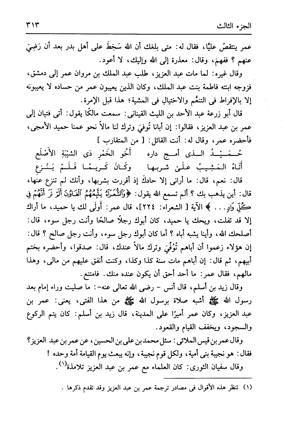 عمر يتنقص عليا فَقَالَ لَهُ مَتى بلغك أَن الله سَخِطَ على أهل بدر بعد أَن رَضيَ عَنْهُم ففهم وَقَالَ معذرة إِلَى الله وَإِلَيْك لَا أَعُود وَقَالَ غَيره لما مَاتَ عبد الْعَزِيز طلب عبد الْملك بن مَرْوَان عمر إِلَى دمشق فزوجته ابْنَته فَاطِمَة بنت عبد الْملك وَكَانَ الَّذين يعيبون عمر من حساده لَا يعيبونه إِلَّا بالإفراط فِي التنعم والاختيالِ فِي المشية هَذَا قبل الإمرة قَالَ أَبُو زرْعَة عبد الْأَحَد بن اللَّيْث القيناني سَمِعت مَالِكًا يَقُول أَتَى فتيَان إِلَى عمر بن عبد العزز فَقَالُوا إِن أَبَانَا تُوفيَ وَترك لنا مالاَ نَحْو عمنَا حميد الأمجي فَأحْضرهُ عمر وَقَالَ لَهُ أَنْت الْقَائِل من // (المتقارب) //
