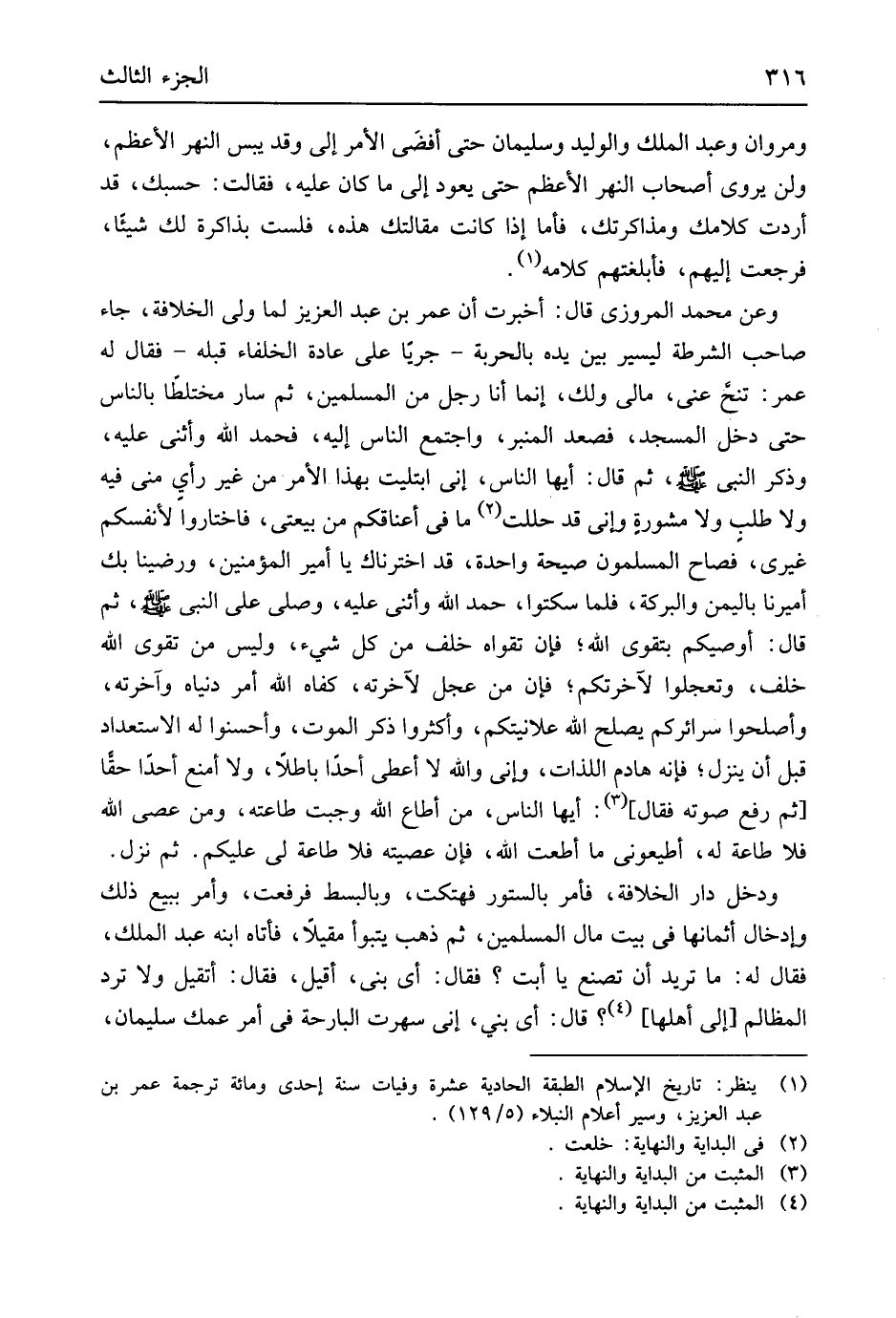 ومروان وَعبد الْملك والوليد وَسليمَان حَتَّى أفضَى الْأَمر إِلَيّ وَقد يبس النَّهر الْأَعْظَم وَلنْ يرْوى أَصْحَاب النَّهر الْأَعْظَم حَتَّى يعود إِلَى مَا كَانَ عَلَيْهِ فَقَالَت حَسبك قد أردْت كلامك ومذاكرتك فَأَما إِذا كَانَت مَقَالَتك هَذِه فلست بذاكرة لَك شَيْئا فَرَجَعت إِلَيْهِم فأبلغتهم كَلَامه وَعَن مُحَمَّد الْمروزِي قَالَ أخْبرت أَن عمر بن عبد الْعَزِيز لما ولي الْخلَافَة جَاءَ صَاحب الشرطة ليسير بَين يَده بالحربة جَريا على عَادَة الْخُلَفَاء قبله فَقَالَ لَهُ عمر تنحَّ عني مَالِي وَلَك إِنَّمَا أَنا رجل من الْمُسلمين ثمَّ سَار مختلطاً بِالنَّاسِ حَتَّى دخل الْمَسْجِد فَصَعدَ الْمِنْبَر وَاجْتمعَ النَّاس إِلَيْهِ فَحَمدَ الله وَأثْنى عَلَيْهِ وَذكر النَّبِي