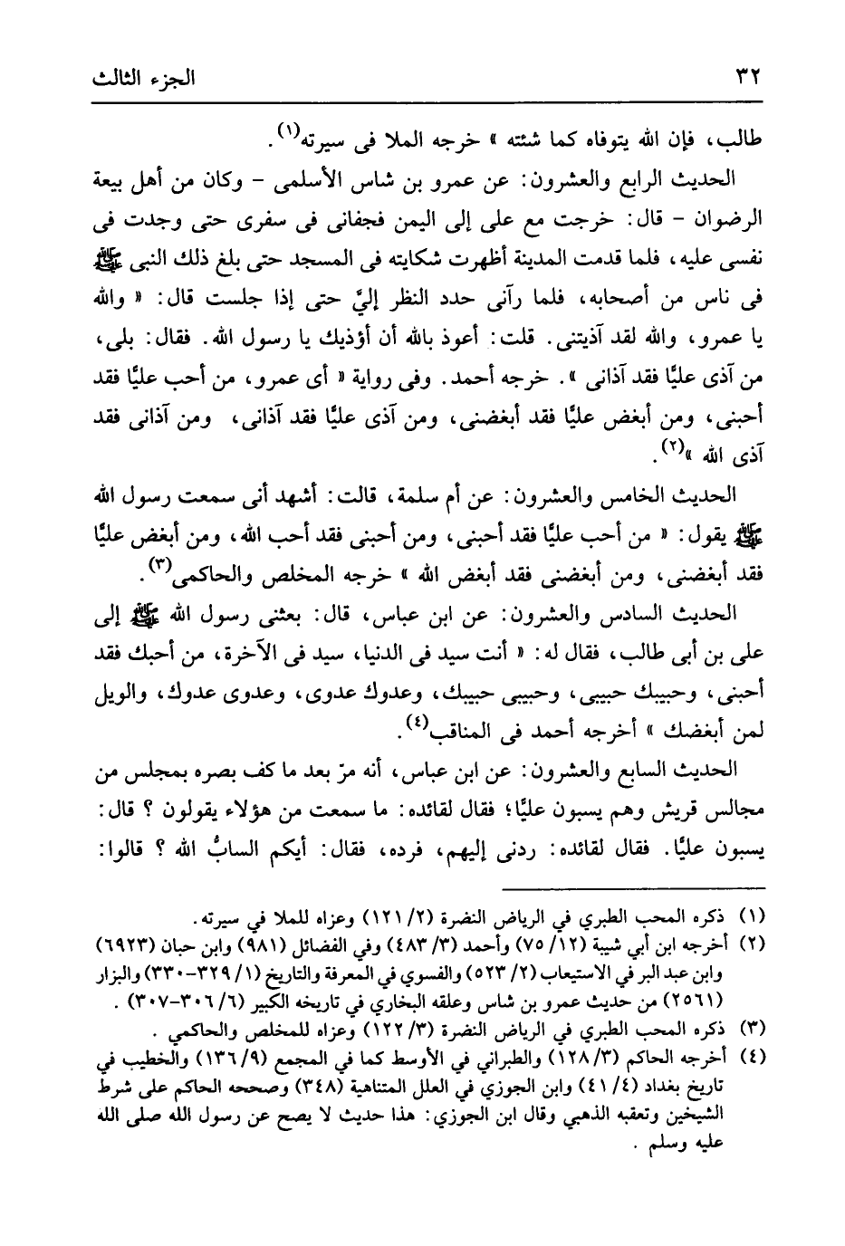 فِي نَاس من أَصْحَابه فَلَمَّا رَآنِي حدد النّظر إِلَيّ حَتَّى إِذا جَلَست قَالَ وَالله يَا عَمْرو وَالله لقد آذيتني قلت أعوذ بِاللَّه أَن أؤذيك يَا رَسُول الله فَقَالَ بلَى من آذَى عليا فقد آذَانِي خرجه أَحْمد وَفِي رِوَايَة أَي عَمْرو من أحب عليا فقد أَحبَّنِي وَمن أبْغض عليا فقد أبغضني وَمن آذَى عليا فقد آذَانِي وَمن آذَانِي فقد آذَى الله الحَدِيث الْخَامِس وَالْعشْرُونَ