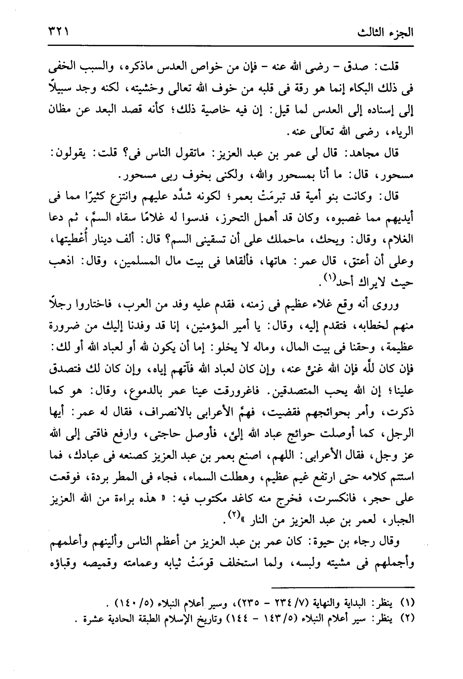 قلت صدق رَضِي الله عَنهُ فَإِن من خَواص العدس مَا ذكره وَالسَّبَب الْخَفي فِي ذَلِك الْبكاء إِنَّمَا هُوَ رقة فِي قلبه من خوف الله تَعَالَى وخشيته لكنه وجد سَبِيلا إِلَى إِسْنَاده إِلَى العدس لما قيل إِن فِيهِ خاصية ذَلِك كَأَنَّهُ قصد الْبعد عَن مظان الرِّيَاء رَضِي الله تَعَالَى عَنهُ قَالَ مُجَاهِد قَالَ لي عمر بن عبد الْعَزِيز مَا تَقول النَّاس فِي قلت يَقُولُونَ مسحور قَالَ مَا أَنا بمسحور وَالله وَلَكِنِّي بخوف رَبِّي مسحور قَالَ وَكَانَت بَنو أُميَّة قد تبرمَتْ بعمر لكَونه شدَد عَلَيْهِم وانتزع كثيرا مِمَّا فِي أَيْديهم مِمَّا غصبوه وَكَانَ قد أهمل التَّحَرُّز فدسوا لَهُ غُلَاما سقَاهُ السمَّ ثمَّ دَعَا الْغُلَام وَقَالَ وَيحك مَا حملك على أَن تسقيني السم قَالَ ألف دِينَار أُعْطيتها وعَلى أَن أعتق قَالَ عمر هَاتِهَا فألقاها فِي بَيت مَال الْمُسلمين وَقَالَ اذْهَبْ حَيْثُ لَا يراك أحد وروى أَنه وَقع غلاء عَظِيم فِي زَمَنه فَقدم عَلَيْهِ وَفد من الْعَرَب فَاخْتَارُوا رجلا مِنْهُم لخطابه فَتقدم إِلَيْهِ وَقَالَ يَا أَمِير الْمُؤمنِينَ إِنَّا قد وفدنا إِلَيْك من ضَرُورَة عَظِيمَة وحقنا فِي بَيت المَال وَمَاله لَا يَخْلُو إِمَّا أَن يكون لله أَو لعباد الله أَو لَك فَإِن كَانَ لله فَإِن الله غَنِي عَنهُ وَإِن كَانَ لعباد الله فأَتهم إِيَّاه وَإِن كَانَ لَك فَتصدق علينا إِن الله يحب المتصدقين فاغرورقت عينا عمر بالدموع وَقَالَ هُوَ كَمَا ذكرت وَأمر بحوائجهم فَقضيت فهم الْأَعرَابِي بالانصراف فَقَالَ لَهُ عمر أَيهَا الرجل كَمَا أوصلت حوائج عباد الله إليَ فأوصل حَاجَتي وارفع فَاقَتِي إِلَى الله عز وَجل فَقَالَ الْأَعرَابِي اللَّهُمَّ اصْنَع بعمر بن عبد الْعَزِيز كصنعه فِي عِبَادك فَمَا استتم كَلَامه حَتَّى ارْتَفع غيم عَظِيم وهطلت السَّمَاء فجَاء فِي الْمَطَر بردة فَوَقَعت على حجر فَانْكَسَرت فَخرج مِنْهُ كاغد مَكْتُوب فِيهِ هَذِه بَرَاءَة من الله الْعَزِيز الْجَبَّار لعمر بن عبد الْعَزِيز من النَّار وَقَالَ رَجَاء بن حَيْوَة كَانَ عمر بن عبد الْعَزِيز من أعظم النَّاس وألينهم وأعلمهم وأجملهم فِي مشيته ولبسه وَلما اسْتخْلف قومَت ثِيَابه وعمامته وقميصه وقباؤه