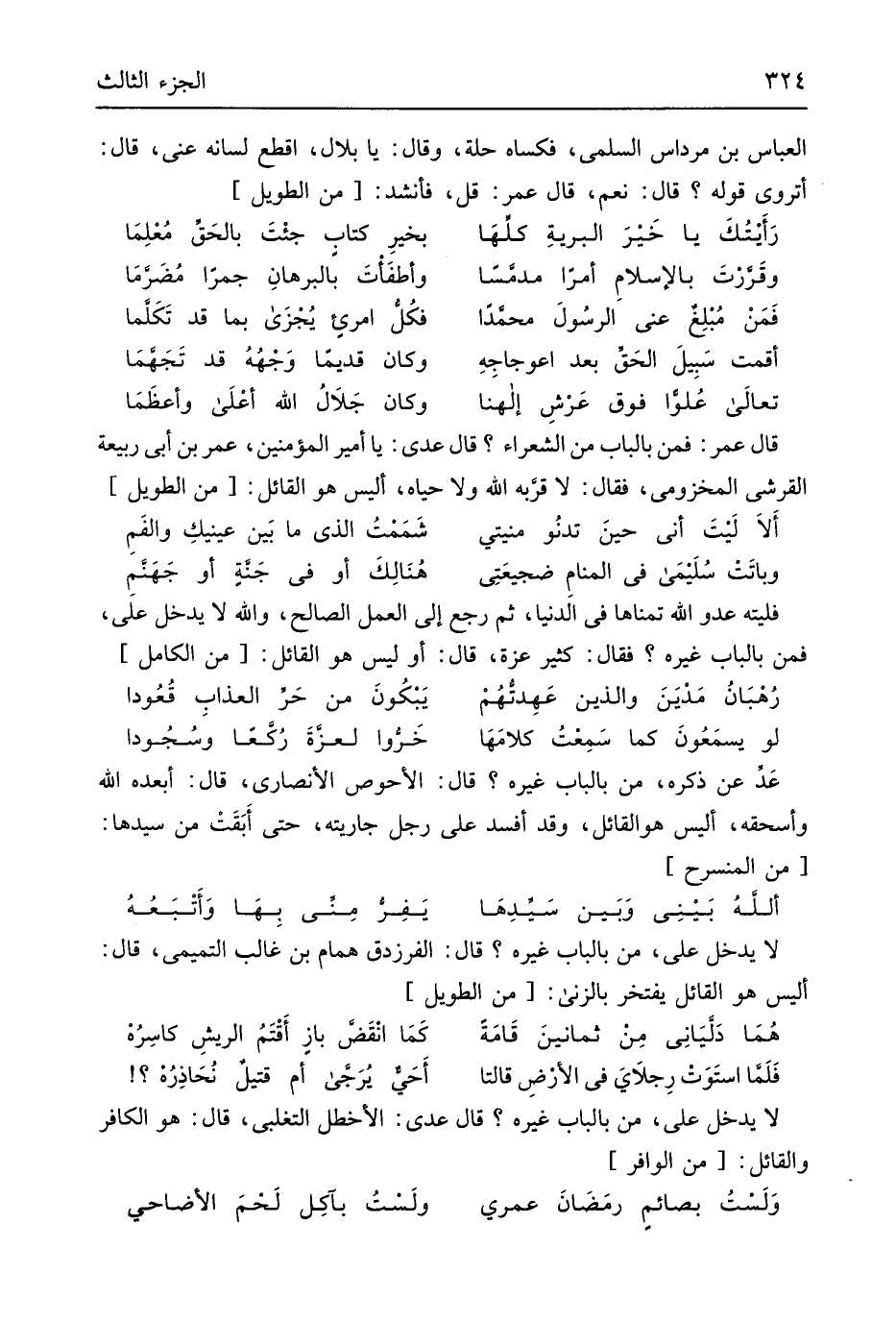 الْعَبَّاس بن مرداس السّلمِيّ فَكَسَاهُ حلَّة وَقَالَ يَا بِلَال اقْطَعْ لِسَانه عني قَالَ أتروي قَوْله قَالَ نعم قَالَ عمر قل فَأَنْشد من // (الطَّوِيل) //