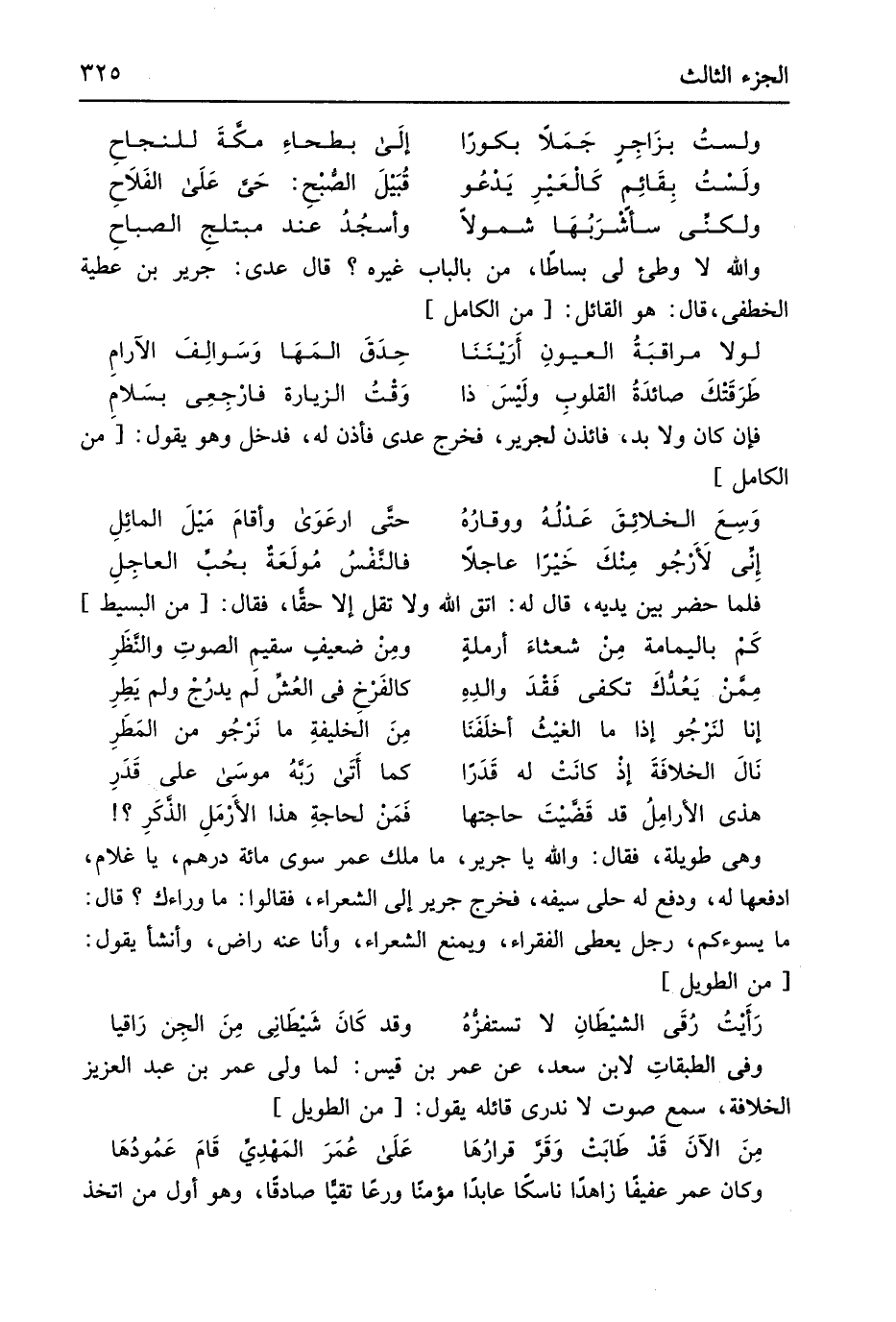 وَهِي طَوِيلَة فَقَالَ وَالله يَا جرير مَا ملك عمر سوى مائَة دِرْهَم يَا غُلَام ادفعها لَهُ وَدفع لَهُ حلي سَيْفه فَخرج جرير إِلَى الشُّعَرَاء فَقَالُوا مَا وَرَاءَك قَالَ مَا يسوءكم رجل يُعْطي الْفُقَرَاء وَيمْنَع الشُّعَرَاء وَأَنا عَنهُ رَاض وَأَنْشَأَ يَقُول من // (الطَّوِيل) //