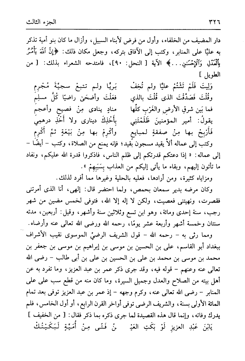 وَكتب إِلَى عماله أَلا يُقيد مسجون بِقَيْد فَإِنَّهُ يمْنَع من الصَّلَاة وَكتب أَيْضا إِلَى عماله إِذا دعتكم قدرتكم إِلَى ظلم النَّاس فاذكروا قدرَة الله عَلَيْكُم ونفاد مَا تأتون إِلَيْهِم وَبَقَاء مَا يَأْتِي إِلَيْكُم من الْعَذَاب بِسَبَبِهِمْ ومزاياه كَثِيرَة وَمن أرادها فَعَلَيهِ بالحلية وَغَيرهَا مِمَّا أفرد لذَلِك وَكَانَ مَرضه بدير سمْعَان بحمص وَلما احْتضرَ قَالَ إلهي أَنا الَّذِي أَمرتنِي فقصرت ونهيتني فعصيت وَلَكِن لَا إِلَه إِلَّا الله فَتوفي من لخمس مضين من شهر رَجَب سنة إِحْدَى وَمِائَة وَهُوَ ابْن تسع وَثَلَاثِينَ سنة وَأشهر وَقيل أَرْبَعِينَ مدَّته سنتَانِ وَخَمْسَة أشهر وَأَرْبَعَة عشر يومَاً رَحمَه الله وَرَضي الله تَعَالَى عَنهُ وأرضاه وَمِمَّا رثي بِهِ رَحمَه الله قَول الشريف الرضي الموسوي نقيب الْأَشْرَاف بِبَغْدَاد أَبُو الْقَاسِم عَليّ بن الْحُسَيْن بن مُوسَى بن إِبْرَاهِيم بن مُوسَى ين جَعْفَر بن مُحَمَّد بِمن مُوسَى بن مُحَمَّد بن عَليّ بن الْحُسَيْن بن عَليّ بن أبي طَالب رَضِي الله تَعَالَى عَنهُ وعنهم قَوْله فِيهِ وَقد جرى ذكر عمر بن عبد الْعَزِيز وَمَا تفرد بِهِ عَن أهل بَيته من الصّلاح وَالْعدْل وَجَمِيل السِّيرَة وَمَا كَانَ مِنْهُ من قطع سبّ عَليّ على المنابر رَضِي الله تَعَالَى عَنهُ وكرم وَجهه إِذْ عمر بن عبد الْعَزِيز توفّي بعد تَمام الْمِائَة الأولى بِسنة والشريف الرضي توفّي أَوَاخِر الْقرن الرَّابِع أَو أول الْخَامِس فَلم يدْرك وَفَاته وَإِنَّمَا قَالَ هَذِه القصيدة لما جرى ذكره بِمَا ذكر فَقَالَ من // (الْخَفِيف) //)