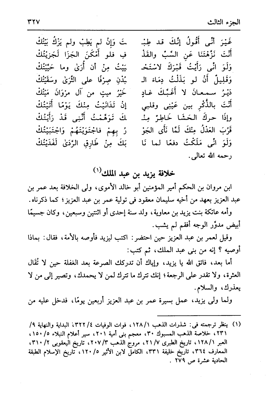 ابْن مَرْوَان بن الحكم أَمِير الْمُؤمنِينَ أَبُو خَالِد الْأمَوِي ولي الْخلَافَة بعد عمر بن عبد الْعَزِيز بِعَهْد من أَخِيه سُلَيْمَان مَعْقُود فِي تَوْلِيَة عمر بن عبد الْعَزِيز كَمَا ذَكرْنَاهُ وَأمه عَاتِكَة بنت يزِيد بن مُعَاوِيَة ولد سنة إِحْدَى أَو اثْنَتَيْنِ وَسبعين وَكَانَ جسيماً أَبيض مدوَر الْوَجْه أفقم لم يشب وَقيل لعمر بن عبد الْعَزِيز حِين احْتضرَ اكْتُبْ ليزِيد فأوصه بالأمة فَقَالَ بِمَاذَا أوصيه إِنَّه من بني عبد الْملك ثمَّ كتب أما بعد فَاتق الله يَا يزِيد وَإِيَّاك أَن تدركك الصرعة بعد الْغَفْلَة حِين لَا تُقَال العثرة وَلَا تقدر على الرّجْعَة إِنَّك تتْرك مَا تتْرك لمن لَا يحمدك وَتصير إِلَى من لَا يعذرك وَالسَّلَام وَلما ولي يزِيد عمل بسيرة عمر بن عبد الْعَزِيز أَرْبَعِينَ يَوْمًا فَدخل عَلَيْهِ من