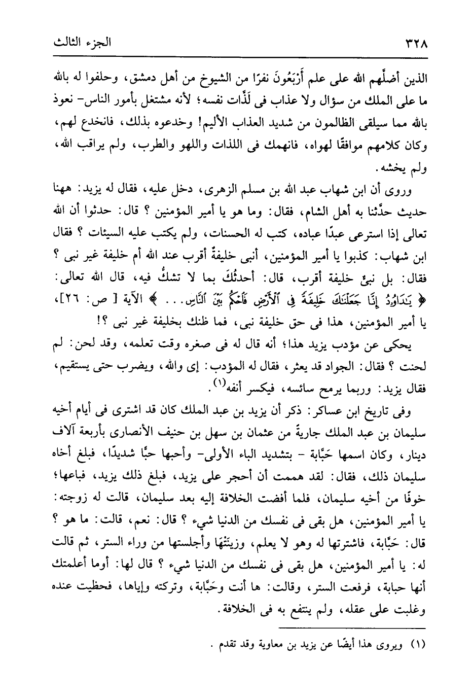 الَّذين أضلهم الله على علم أَربَعُونَ نَفرا من الشُّيُوخ من أهل دمشق وحلفوا لَهُ بِاللَّه مَا على الْملك من سُؤال وَلَا عَذَاب فِي لَذات نَفسه لِأَنَّهُ مشتغل بِأُمُور النَّاس نَعُوذ بِاللَّه مِمَّا سيلقى الظَّالِمُونَ من شَدِيد الْعَذَاب الْأَلِيم وخدعوه بذلك فانخدع لَهُم وَكَانَ كَلَامهم موفقا لهواه فانهمك فِي اللَّذَّات وَاللَّهْو والطرب وَلم يراقب الله وَلم يخشه وَرُوِيَ أَن شهَاب عبد الله بن مُسلم الزُّهْرِيّ دخل عَلَيْهِ فَقَالَ لَهُ يزِيد هَهُنَا حَدِيث حَدثنَا بِهِ أهل الشَّام فَقَالَ وَمَا هُوَ يَا أَمِير الْمُؤمنِينَ قَالَ حدثوا أَن الله تَعَالَى إِذا استرعى عبدا عباده كتب لَهُ الْحَسَنَات وَلم يكْتب عَلَيْهِ السَّيِّئَات فَقَالَ ابْن شهَاب كذبُوا يَا أَمِير الْمُؤمنِينَ أَنَبِي خَليفَة أقرب عِنْد الله أم خَليفَة غير نَبِي فَقَالَ بل نَبِي خَليفَة أقرب قَالَ أحدثُكَ بِمَا لَا تشكُّ فِيهِ قَالَ الله تَعَالَى {يَا دَاودُ إِنا جَعلناك خليفَة فِي اَلأَرضِ فاحكمُ بَين اَلناسِ} الْآيَة ص 26 يَا أَمِير الْمُؤمنِينَ هَذَا فِي حق خَليفَة نَبِي فَمَا ظَنك بخليفة غير نَبِي يحْكى عَن مؤدب يزِيد هَذَا أَنه قَالَ لَهُ فِي صغره وَقت تعلمه وَقد لحن لم لحنت فَقَالَ الْجواد قد يعثر فَقَالَ لَهُ الْمُؤَدب إِي وَالله وَيضْرب حَتَّى يَسْتَقِيم فَقَالَ يزِيد وَرُبمَا يرمح سائسه فيكسر أَنفه وَفِي تَارِيخ ابْن عَسَاكِر ذكر أَن يزِيد بن عبد الْملك كَانَ قد اشْترى فِي أَيَّام أَخِيه سُلَيْمَان بن عبد الْملك جَارِيَة من عُثْمَان بن سهل بن حنيف الْأنْصَارِيّ بأَرْبعَة آلَاف دِينَار وَكَانَ اسْمهَا حَبابة بتَشْديد الْبَاء الأولى وأحبها حبا شَدِيدا فَبلغ أَخَاهُ سُلَيْمَان ذَلِك فَقَالَ لقد هَمَمْت أَن أحجر على يزِيد فَبلغ ذَلِك يزِيد فَبَاعَهَا خوفَاً من أَخِيه سُلَيْمَان فَلَمَّا أفضت الْخلَافَة إِلَيْهِ بعد سُلَيْمَان قَالَت لَهُ زَوجته يَا أَمِير الْمُؤمنِينَ هَل بَقِي فِي نَفسك من الدُّنْيَا شَيْء قَالَ نعم قَالَت مَا هُوَ قَالَ حَبابة فاشترتها لَهُ وَهُوَ لَا يعلم وزينَتهَا وأجلستها من وَرَاء السّتْر ثمَّ قَالَت لَهُ يَا أَمِير الْمُؤمنِينَ هَل بَقِي فِي نَفسك فِي الدُّنْيَا شَيْء قَالَ لَهَا أَو مَا أعلمتك أَنَّهَا حبابة فَرفعت السّتْر وَقَالَت هَا أَنْت وحبابة وَتركته إِيَّاهَا فحظيت عِنْده وغلبت على عقله وَلم ينْتَفع بِهِ فِي الْخلَافَة
