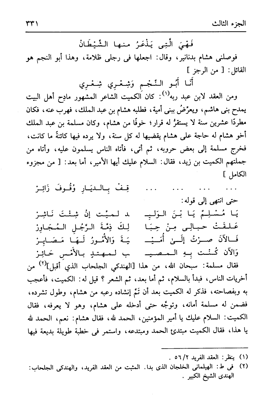 وَمن العقد لِابْنِ عبد ربه كَانَ الْكُمَيْت الشَّاعِر الْمَشْهُور مادِح أهل الْبَيْت يمدح بني هَاشم ويعرضُ ببني أُميَّة فَطَلَبه هِشَام بن عبد الْملك فهرب عَنهُ فَكَانَ مطرداً عشْرين سنة لَا يستقرُ لَهُ قَرَار خوفًا من هِشَام وَكَانَ مسلمة بن عبد الْملك أَخُو هِشَام لَهُ حَاجَة على هِشَام يَقْضِيهَا لَهُ كل سنة وَلَا يردهُ فِيهَا كائنة مَا كَانَت فَخرج مسلمة إِلَى بعض حروبه ثمَّ أَتَى فَأَتَاهُ النَّاس يسلمُونَ عَلَيْهِ وَأَتَاهُ من جُمْلَتهمْ الْكُمَيْت بن زيد فَقَالَ السَّلَام عَلَيْك يَا أَيهَا الْأَمِير أما بعد من // (مجزوء الْكَامِل) //