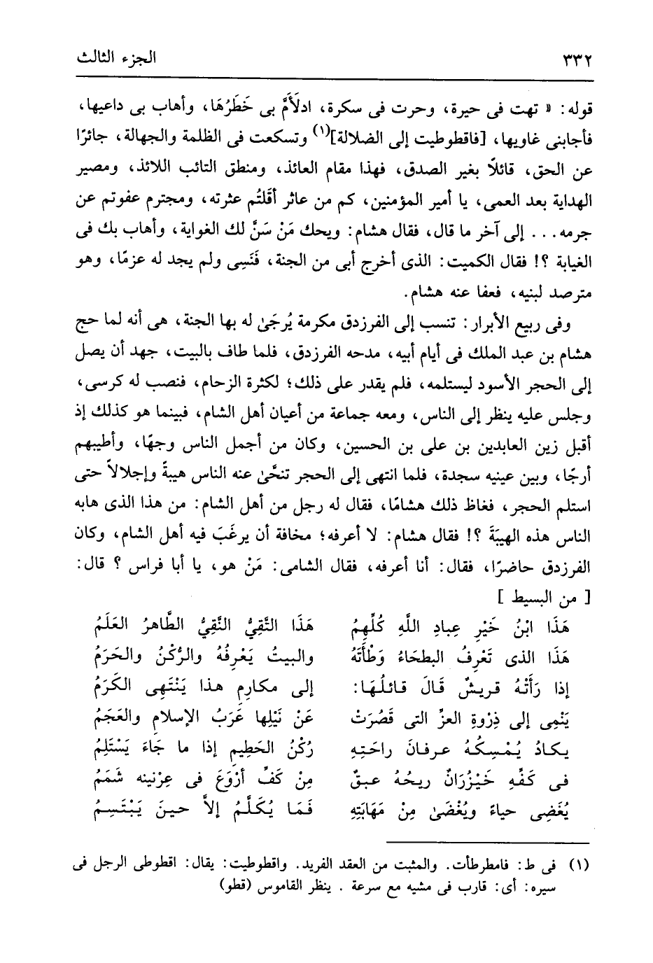 قَوْله تهت فِي حيرة وحرت فِي سكرة ادلأَم بِي خَطَرُهَا وأهاب بِي داعيها فَأَجَابَنِي غاويها فاقطوطيت إِلَى الضَّلَالَة وتسكعت فِي الظلمَة والجهالة جائراً عَن الْحق قَائِلا بِغَيْر الصدْق فَهَذَا مقَام العائذ ومنطق التائب اللائذ ومصير الْهِدَايَة بعد الْعمي يَا أَمِير الْمُؤمنِينَ كم من عاثر أقَلتُم عثرته ومجترم عفوتم عَن جرمه إِلَى آخر مَا قَالَ فَقَالَ هِشَام وَيحك من سَن لَك الغواية وأهاب بك فِي الغيابة فَقَالَ الْكُمَيْت الَّذِي أخرج أبي من الْجنَّة فَنَسِي وَلم يجد لَهُ عزماً وَهُوَ مترصد لِبَنِيهِ فَعَفَا عَنهُ هِشَام وَفِي ربيع الْأَبْرَار تنْسب إِلَى الفرزدق مكرمَة يُرجَى لَهُ بهَا الْجنَّة هِيَ أَنه لما حج هِشَام بن عبد الْملك فِي أَيَّام أَبِيه مدحه الفرزدق فَلَمَّا طَاف بِالْبَيْتِ جهد أَن يصل إِلَى الْحجر الْأسود ليستلمه فَلم يقدر على ذَلِك لِكَثْرَة الزحام فنصب لَهُ كرْسِي وَجلسَ عَلَيْهِ ينظر إِلَى النَّاس وَمَعَهُ جمَاعَة من أَعْيَان أهل الشَّام فَبَيْنَمَا هُوَ كَذَلِك إِذْ أقبل زين العابدين بن عَليّ بن الْحُسَيْن وَكَانَ من أجمل النَّاس وَجها وأطيبهم أرجاً وَبَين عَيْنَيْهِ سَجْدَة فَلَمَّا انْتهى إِلَى الْحجر تنحى عَنهُ النَّاس هَيْبَة وإجلالاً حَتَّى اسْتَلم الْحجر فغاظ ذَلِك هشاماً فَقَالَ لَهُ رجل من أهل الشَّام من هَذَا الَّذِي هابه النَّاس هَذِه الهيبة فَقَالَ هِشَام لَا أعرفهُ مَخَافَة أَن يرغَبَ فِيهِ أهل الشَّام وَكَانَ الفرزدق حَاضرا فَقَالَ أَنا أعرفهُ فَقَالَ الشَّامي من هُوَ يَا أَبَا فراس قَالَ // (من الْبَسِيط) //
