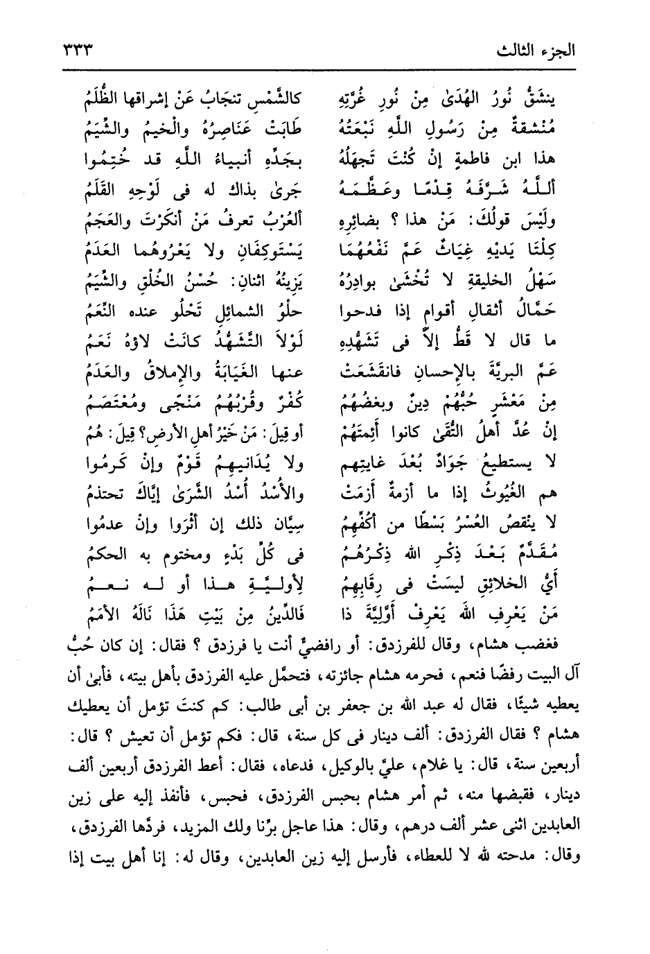 فَغَضب هِشَام وَقَالَ للفرزدق أَو رَافِضِي أَنْت يَا فرزدق فَقَالَ إِن كَانَ حب آل الْبَيْت رفضاً فَنعم فحرمه هِشَام جائزته فَتحمل عَلَيْهِ الفرزدق بِأَهْل بَيته فَأبى أَن يُعْطِيهِ شَيْئا فَقَالَ لَهُ عبد الله بن جَعْفَر بن أبي طَالب كم كنتَ تؤمل أَن يعطيك هِشَام فَقَالَ الفرزدق ألف دِينَار فِي كل سنة قَالَ فكم تؤمل أَن تعيش قَالَ أَرْبَعِينَ سنة قَالَ يَا غُلَام عَليّ بالوكيل فَدَعَاهُ فَقَالَ أعْط الفرزدق أَرْبَعِينَ ألف دِينَار فقبضها مِنْهُ ثمَّ أَمر هِشَام بِحَبْس الفرزدق فحبس فأنفذ إِلَيْهِ على زين العابدين اثْنَي عشر ألف دِرْهَم وَقَالَ هَذَا عَاجل برنا وَلَك الْمَزِيد فَردهَا الفرزدق وَقَالَ مدحته لله لَا للعطاء فَأرْسل إِلَيْهِ زين العابدين وَقَالَ لَهُ إِنَّا أهل بَيت إِذا