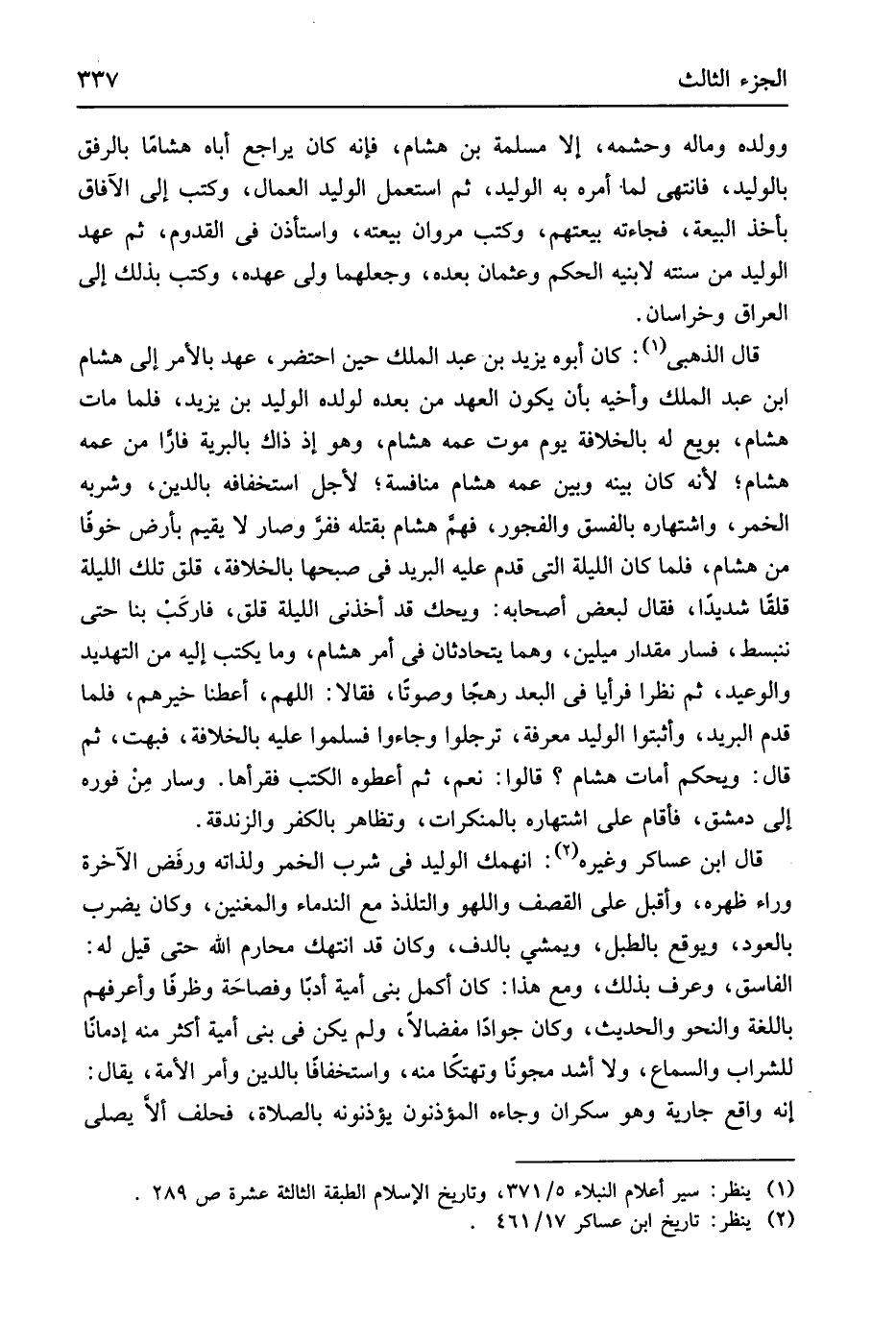 وَولده وَمَاله وحشمه إِلَّا مسلمة بن هِشَام فَإِنَّهُ كَانَ يُرَاجع أَبَاهُ هشاماً بالرفق بالوليد فَانْتهى لما أمره بِهِ الْوَلِيد ثمَّ اسْتعْمل الْوَلِيد الْعمَّال وَكتب إِلَى الْآفَاق بِأخذ الْبيعَة فَجَاءَتْهُ بيعتهم وَكتب مَرْوَان بيعَته وَاسْتَأْذَنَ فِي الْقدوم ثمَّ عهد الْوَلِيد من سنته لابْنَيْهِ الحكم وَعُثْمَان بعده وجعلهما ولي عَهده وَكتب بذلك إِلَى الْعرَاق وخرسان قَالَ الذَّهَبِيّ كَانَ أَبوهُ يزِيد بن عبد الْملك حِين احْتضرَ عهد بِالْأَمر إِلَى هِشَام ابْن عبد الْملك وأخيه بِأَن يكون الْعَهْد من بعده لوَلَده الْوَلِيد بن يزِيد فَلَمَّا مَاتَ هِشَام بُويِعَ لَهُ بالخلافة يَوْم موت عَمه هِشَام وَهُوَ إِذْ ذَاك بالبرية فَارًّا من عَمه هِشَام لِأَنَّهُ كَانَ بَينه وَبَين عَمه هِشَام مُنَافَسَة لأجل استخفافه بِالدّينِ وشربه الْخمر واشتهاره بِالْفِسْقِ والفجور فهم هِشَام بقتْله ففر وَصَارَ لَا يُقيم بِأَرْض خوفًا من هِشَام فَلَمَّا كَانَ اللَّيْلَة الَّتِي قدم عَلَيْهِ الْبَرِيد فِي صبحها بالخلافة قلق تِلْكَ اللَّيْلَة قلقاً شَدِيدا فَقَالَ لبَعض أَصْحَابه وَيحك قد أَخَذَنِي اللَّيْلَة قلق فاركَبْ بِنَا حَتَّى ننبسط فَسَار مِقْدَار ميلين وهما يتحادثان فِي أَمر هِشَام وَمَا يكْتب إِلَيْهِ من التهديد والوعيد ثمَّ نظرا فرأيا فِي الْبعد رهجاً وصوتاً فَقَالَا اللَّهُمَّ أعطنا خَيرهمْ فَلَمَّا قدم الْبَرِيد وأثبتوا الْوَلِيد معرفَة ترجلوا وَجَاءُوا فَسَلمُوا عَلَيْهِ بالخلافة فبهت ثمَّ قَالَ وَيحكم أمات هِشَام قَالُوا نعم ثمَّ أَعْطوهُ الْكتب فقرأها وَسَار مِنْ فوره إِلَى دمشق فَأَقَامَ على اشتهاره بالمنكرات وتظاهر بالْكفْر والزندقة قَالَ ابْن عَسَاكِر وَغَيره انهمك الْوَلِيد فِي شرب الْخمر ولذاته ورفَض الْآخِرَة وَرَاء ظَهره وَأَقْبل على القصف وَاللَّهْو والتلذذ مَعَ الندماء والمغنين وَكَانَ يضْرب بِالْعودِ ويوقع بالطبل وَيَمْشي بالدف وَكَانَ قد انتهك محارم الله حَتَّى قيل لَهُ الْفَاسِق وَعرف بذلك وَمَعَ هَذَا كَانَ أكمل بني أُميَّة أدباً وفصاحَة وظرفاً وأعرفهم باللغة والنحو والْحَدِيث وَكَانَ جوادَاً مفضالاً وَلم يكن فِي بني أُميَّة أَكثر مِنْهُ إدماناً للشراب وَالسَّمَاع وَلَا أَشد مجوناً وتهتكاً مِنْهُ واستخفافَاً بِالدّينِ وَأمر الْأمة يُقَال إِنَّه وَاقع جَارِيَة وَهُوَ سَكرَان وجاءه المؤذنون يؤذنونه بِالصَّلَاةِ فَحلف ألاَ يُصَلِّي