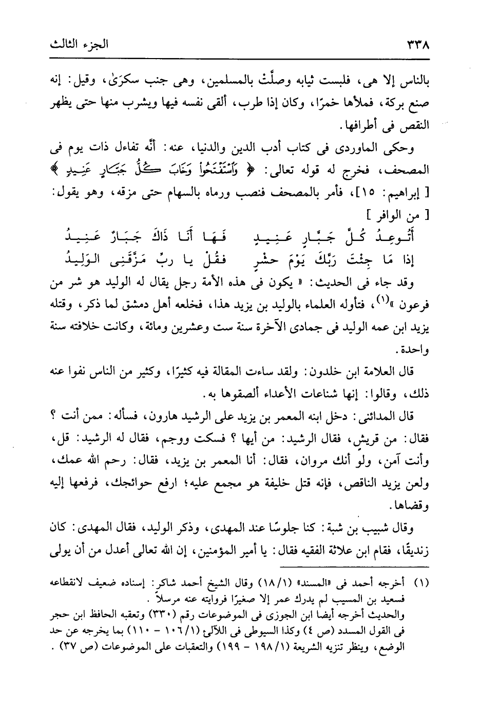 بِالنَّاسِ إِلَّا هِيَ فَلبِست ثِيَابه وصلت بِالْمُسْلِمين وَهِي جنب سكرَى وَقيل إِنَّه صنع بركَة فملأها خمرًا وَكَانَ إِذا طرب ألْقى نَفسه فِيهَا وَيشْرب مِنْهَا حَتَّى يظْهر النَّقْص فِي أطرافها وَحكى الْمَاوَرْدِيّ فِي كتاب أدب الدّين وَالدُّنْيَا عَنهُ أَنه تفاءل ذَات يَوْم فِي الْمُصحف فَخرج لَهُ قَوْله تَعَالَى {وَاَسْتَفتحوُا وخَابَ كُلُّ جَبَّارٍ عَنيد} إِبْرَاهِيم 15 فَأمر بالمصحف فنصب ورماه بِالسِّهَامِ حَتَّى مزقه وَهُوَ يَقُول // (من الوافر) //