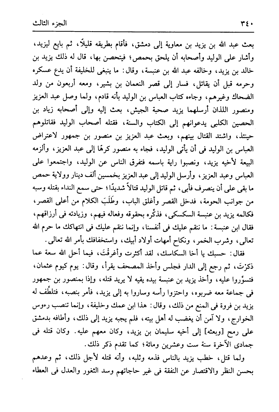 بعث عبد الله بن يزِيد بن مُعَاوِيَة إِلَى دمشق فَأَقَامَ بطريقه قَلِيلا ثمَّ بَايع ليزِيد وَأَشَارَ على الْوَلِيد وَأَصْحَابه أَن يلْحق بحمص فيتحصن بهَا قَالَ لَهُ ذَلِك يزِيد بن خَالِد بن يزِيد وَخَالفهُ عبد الله بن عَنْبَسَة وَقَالَ مَا يَنْبَغِي للخليفة أَن يدع عسكره وَحرمه قبل أَن يُقَاتل فَسَار إِلَى قصر النُّعْمَان بن بشير وَمَعَهُ أَرْبَعُونَ من ولد الضَّحَّاك وَغَيرهم وجاءه كتاب الْعَبَّاس بن الْوَلِيد بِأَنَّهُ قادم وَلما وصل عبد الْعَزِيز وَمَنْصُور اللَّذَان أرسلهما يزِيد صُحْبَة الْجَيْش بعث إِلَيْهِ وَإِلَى أَصْحَابه زِيَاد بن الْحصين الْكَلْبِيّ يدعوانهم إِلَى الْكتاب وَالسّنة فَقتله أَصْحَاب الْوَلِيد فقَاتلوهم حِينَئِذٍ وَاشْتَدَّ الْقِتَال بَينهم وَبعث عبد الْعَزِيز بن مَنْصُور بن جُمْهُور لاعتراض الْعَبَّاس بن الْوَلِيد فِي أَن يَأْتِي الْوَلِيد فجَاء بِهِ مَنْصُور كرها إِلَى عبد الْعَزِيز وألزمه الْبيعَة لِأَخِيهِ يزِيد ونصبوا راية باسمه فتفرقْ النَّاس عَن الْوَلِيد واجتمعوا على الْعَبَّاس وَعبد الْعَزِيز وَأرْسل الْوَلِيد إِلَى عبد الْعَزِيز بِخَمْسِينَ ألف دِينَار وَولَايَة حمص مَا بَقِي على أَن ينْصَرف فَأبى ثمَّ قَاتل الْوَلِيد قتالاً شَدِيدا حَتَّى سمع النداء بقتْله وسبه من جَوَانِب الحومة فَدخل الْقصر وأغلق الْبَاب وطَلَبَ الْكَلَام من أَعلَى الْقصر فكالمه يزِيد بن عَنْبَسَة السكْسكِي فَذكره بحقوقة وفعاله فيهم وزيادته فِي أَرْزَاقهم فَقَالَ ابْن عَنْبَسَة مَا ننقم عَلَيْك فِي أَنْفُسنَا وَإِنَّمَا ننقم عَلَيْك فِي انتهاكك مَا حرم الله تَعَالَى وَشرب الْخمر وَنِكَاح أُمَّهَات أَوْلَاد أَبِيك واستخفافك بِأَمْر الله تَعَالَى فَقَالَ حَسبك يَا أَخا السكاسك لقد أكثرت وأغرقْتَ فِيمَا أحل الله سَعَة عَمَّا ذكرتَ ثمَّ رَجَعَ إِلَى الدَّار فَجَلَسَ وَأخذ الْمُصحف يقْرَأ وَقَالَ يَوْم كَيَوْم عُثْمَان فتسوروا عَلَيْهِ وَأخذ يزِيد بن عنبسهّ بِيَدِهِ يَقِيه لَا يُرِيد قَتله وَإِذا بمنصور بن جُمْهُور فِي جمَاعَة مَعَه ضربوه واحتزوا رَأسه وَسَارُوا بِهِ إِلَى يزِيد فَأمر بنصبه فتلطف لَهُ يزِيد بن فَرْوَة فِي الْمَنْع من ذَلِك وقَال هَذَا ابْن عمك وَخَلِيفَة وَإِنَّمَا تنصب رُءُوس الْخَوَارِج وَلَا اَمن أَن يغْضب لَهُ أهل بَيته فَلم يجبهُ يزِيد إِلَى ذَلِك وأطافه بِدِمَشْق على رمح وَبَعثه إِلَى أَخِيه سُلَيْمَان بن يزِيد وَكَانَ مَعَهم عَلَيْهِ وَكَانَ قَتله فِي جُمَادَى الْآخِرَة سنة سِتّ وَعشْرين وَمِائَة كَمَا تقدم ذكر ذَلِك وَلما قتل خطب يزِيد بِالنَّاسِ فذمه وثلبه وَأَنه قَتله لأجل ذَلِك ثمَّ وعدهم بِحسن النّظر والاقتصار عَن النَّفَقَة فِي غير حاجاتهم وسد الثغور وَالْعدْل فِي الْعَطاء