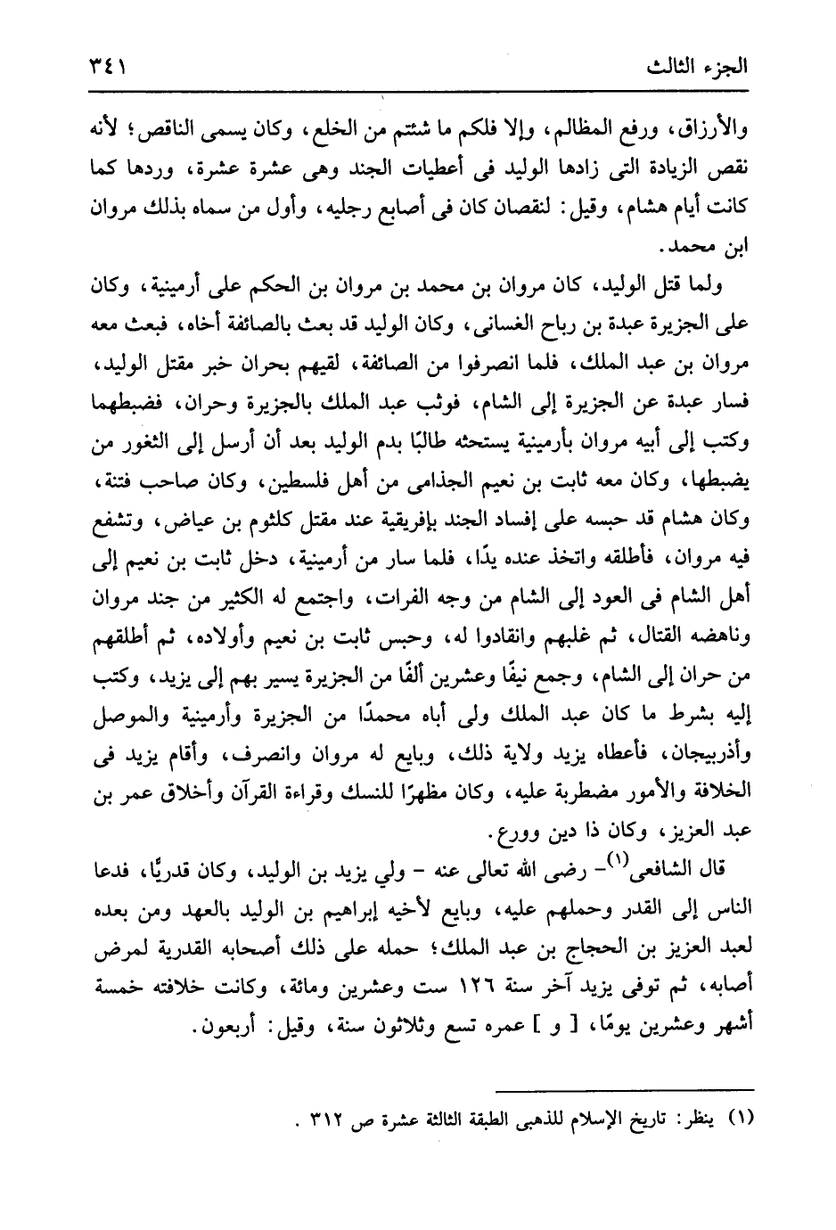 والأرزاق وَرفع الْمَظَالِم وَإِلَّا فلكم مَا شِئْتُم من الْخلْع وَكَانَ يُسمى النَّاقِص لِأَنَّهُ نقص الزِّيَادَة الَّتِي زَادهَا الْوَلِيد فِي أعطيات الْجند وَهِي عشرَة عشرَة وردهَا كَمَا كَانَت أْيام هِشَام وَقيل لنُقْصَان كَانَ فِي أَصَابِع رجلَيْهِ وَأول من سَمَّاهُ بذلك مَرْوَان ابْن مُحَمَّد وَلما قتل الْوَلِيد كَانَ مَرْوَان بن مُحَمَّد بن مَرْوَان بن الحكم على أرمينية وَكَانَ على الجزيرة عَبدة بن رَبَاح الغساني وَكَانَ الْوَلِيد قد بعث بالصائفة أَخَاهُ فَبعث مَعَه مَرْوَان بن عبد الْملك فَلَمَّا انصرفوا من الصائفة لَقِيَهُمْ بحران خبر مقتل الْوَلِيد فَسَار عَبدة عَن الجزيرة إِلَى الشَّام فَوَثَبَ عبد الْملك بالجزيرة وحران فضبطهما وَكتب إِلَى أَبِيه مَرْوَان بأرمينية يستحثه طَالبا بِدَم الْوَلِيد بعد أَن أرسل إِلَى الثغور من يضبطها وَكَانَ مَعَه ثَابت بن نعيم الجذامي من أهل فلسطين وَكَانَ صَاحب فتْنَة وَكَانَ هِشَام قد حَبسه على إِفْسَاد الْجند بإفريقية عِنْد مقتل كُلْثُوم بن عِيَاض وَتشفع فِيهِ مَرْوَان فَأَطْلقهُ وَاتخذ عِنْده يدا فَلَمَّا سَار من أرمينية دخل ثَابت بن نعيم إِلَى أهل الشَّام فِي الْعود إِلَى الشَّام من وَجه الْفُرَات وَاجْتمعَ لَهُ الْكثير من جند مَرْوَان وناهضه الْقِتَال ثمَّ غلبهم وانقادوا لَهُ وَحبس ثَابت بن نعيم وَأَوْلَاده ثمَّ أطلقهُم من حران إِلَى الشَّام وَجمع نيفاً وَعشْرين ألفا من الجزيرة يسير بهم إِلَى يزِيد وَكتب إِلَيْهِ بِشَرْط مَا كَانَ عبد الْملك ولي أَبَاهُ مُحَمَّدًا من الجزيرة وأرمينية والموصل وأذربيجان فَأعْطَاهُ يزِيد ولَايَة ذَلِك وَبَايع لَهُ مَرْوَان وَانْصَرف وَأقَام يزِيد فِي الْخلَافَة والأمور مضطربة عَلَيْهِ وَكَانَ مظْهرا للنسك وَقِرَاءَة الْقُرْآن وأخلاق عمر بن عبد الْعَزِيز وَكَانَ ذَا دين وورع قَالَ الشَّافِعِي رَضِي الله تَعَالَى عَنهُ ولي يزِيد بن الْوَلِيد وَكَانَ قدرياً فَدَعَا النَّاس إِلَى الْقدر وَحَملهمْ عَلَيْهِ وَبَايع لِأَخِيهِ إِبْرَاهِيم بن الْوَلِيد بالعهد وَمن بعده لعبد الْعَزِيز بن الْحجَّاج بن عبد الْملك حمله على ذَلِك أَصْحَابه الْقَدَرِيَّة لمَرض أَصَابَهُ ثمَّ توفّي يزِيد آخر سنة 126 سِتّ وَعشْرين وَمِائَة وَكَانَت خِلَافَته خَمْسَة أشهر وَعشْرين يَوْمًا وعمره تسع وَثَلَاثُونَ سنة وَقيل أَرْبَعُونَ