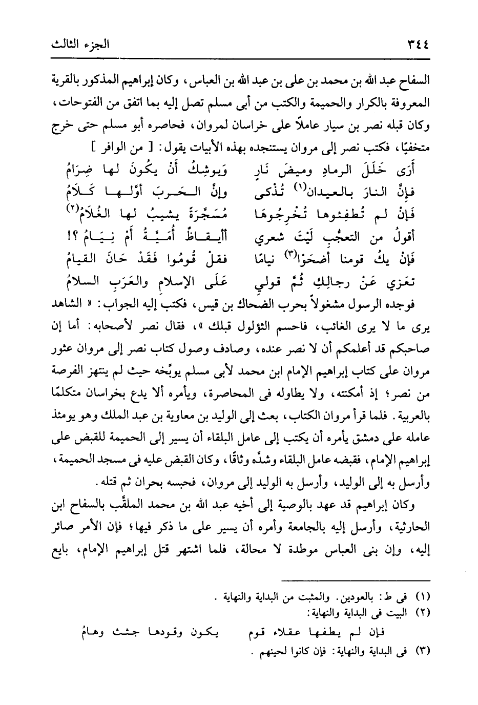 السفاح عبد الله بن مُحَمَّد بن عَليّ بن عبد الله بن الْعَبَّاس وَكَانَ إِبْرَاهِيم الْمَذْكُور بالقرية الْمَعْرُوفَة بالكرار والحميمة والكتب من أبي مُسلم تصل ليه بِمَا اتّفق من الفتوحات وَكَانَ قلبه نصر بن سيار عَاملا على خرسان لمروان فحاصره مُسلم حَتَّى خرج متخفيَاً فَكتب نصر إِلَى مَرْوَان يستنجده بِهَذِهِ الأبيات يَقُول // (من الوافر) //