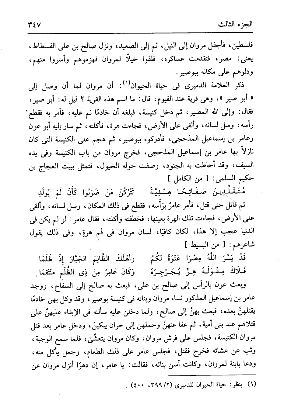 فلسطين فأجفل مَرْوَان إِلَى النّيل ثمَّ إِلَى الصَّعِيد وَنزل صَالح بن عَليّ الْفسْطَاط يَعْنِي مصر فتقدمت عساكره فَلَقوا خيلا لمروان فهزموهم وأسروا مِنْهُم ودلوهم على مَكَانَهُ بيوصر ذكر الْعَلامَة الدَّمِيرِيّ فِي حَيَاة الْحَيَوَان أَن مَرْوَان لما أَن وصل إِلَى أَبُو صير وَهِي قَرْيَة عِنْد الفيوم قَالَ مَا اسْم هَذِه الْقرْيَة قيل لَهُ أَبُو صير فَقَالَ وَإِلَى الله الْمصير ثمَّ دخل كَنِيسَة فَبَلغهُ أَن خَادِمًا نم عَلَيْهِ فَأمر بِهِ فَقطع رَأسه وسل لِسَانه وَألقى على الأَرْض فَجَاءَت هرة فأكلته ثمَّ سَار إِلَيْهِ أَبُو عون وعامر بن إِسْمَاعِيل الْمذْحِجِي فأدركوه ببوصير ثمَّ هجم على الْكَنِيسَة الَّتِي كَانَ نازلا بهَا عَامر بن إِسْمَاعِيل الْمذْحِجِي فَخرج مَرْوَان من بَاب الْكَنِيسَة وَفِي يَده السَّيْف وَقد أحاطت بِهِ الْجنُود وصفت حوله الْخُيُول فتمثل بِبَيْت العجاج بن حَكِيم السّلمِيّ من // (الْكَامِل) //