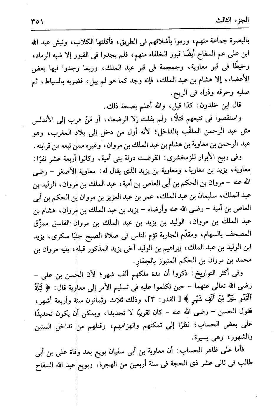 بِالْبَصْرَةِ جمَاعَة مِنْهُم ورموا بأشلائهم فِي الطَّرِيق فَأَكَلتهَا الْكلاب ونبش عبد الله ابْن عَليّ عَم السفاح أَيْضا قُبُور الْخُلَفَاء مِنْهُم فَلم يَجدوا فِي الْقُبُور إِلَّا شبه الرماد وخيطاً فِي قبر مُعَاوِيَة وجمجمة فِي قبر عبد الْملك وَرُبمَا وجدوا فِيهَا بعض الْأَعْضَاء إِلَّا هِشَام بن عبد الْملك فَإِنَّهُ وجد كَمَا هُوَ لم يبل فَضَربهُ بالسياط ثمَّ صلبه وَحَرقه وذراه فِي الرّيح قَالَ ابْن خلدون كَذَا قيل وَالله أعلم بِصِحَّة ذَلِك واستقصوا فِي تتبعهم قتلا وَلم يفلت إِلَّا الرضعاء أَو مَنْ هرب إِلَى الأندلس مثل عبد الرَّحْمَن الملقب بالداخل لِأَنَّهُ أول من دخل إِلَى بِلَاد الْمغرب وَهُوَ عبد الرَّحْمَن بن مُعَاوِيَة بن هِشَام بن عبد الْملك بن مَرْوَان وَغَيره مِمَّن تبعه من قرَابَته وَفِي ربيع الْأَبْرَار للزمخشري انقرضت دولة بني أُميَّة وَكَانُوا أَرْبَعَة عشر نَفرا مُعَاوِيَة يزِيد بن مُعَاوِيَة وَمُعَاوِيَة بن يزِيد الَّذِي يُقَال لَهُ مُعَاوِيَة الْأَصْغَر رَضِي الله عَنهُ مَرْوَان بن الحكم بن أبي الْعَاصِ بن أُميَّة عبد الْملك بن مَرْوَان الْوَلِيد بن عبد الْملك سُلَيْمَان بن عبد الْملك عمر بن عبد الْعَزِيز بن مَرْوَان بن الحكم بن أبي الْعَاصِ بن أُميَّة رَضِي الله عَنهُ وأرضاه يزِيد بن عبد الْملك بن مَرْوَان هِشَام بن عبد الْملك بن مَرْوَان الْوَلِيد بن يزِيد بن عبد الْملك بن مَرْوَان الْفَاسِق ممزق الْمُصحف بِالسِّهَامِ ومقدم الْجَارِيَة تؤم النَّاس فِي صَلَاة الصُّبْح جنبَاً سكرى يزِيد ابْن الْوَلِيد بن عبد الْملك إِبْرَاهِيم بن الْوَلِيد أخي يزِيد الْمَذْكُور قبله يَلِيهِ مَرْوَان بن مُحَمَّد بن مَرْوَان بن الحكم المنبوز بالحِمَارِ وَفِي أَكثر التواريخ ذكرُوا أَن مُدَّة ملكهم ألف شهر لِأَن الْحسن بن عَليّ رَضِي الله تَعَالَى عَنْهُمَا حِين تكلمُوا عَلَيْهِ فِي تَسْلِيم الْأَمر إِلَى مُعَاوِيَة قَالَ {ليلةُ اَلقَدرِ خَير مِنْ ألفِ شهر} الْقدر 3 وَذَلِكَ ثَلَاث وَثَمَانُونَ سنة وَأَرْبَعَة أشهر فَقَوْل الْحسن رَضِي الله عَنهُ كَانَ تَقْرِيبًا لَا تحديداً وَيُمكن أَن يكون تحديداً على بعض الْحساب نظرَاً إِلَى تمكنهم وانهزامهم وقتلهم من تدَاخل السنين والشهور وَهِي يسيرَة فَأَما على ظَاهر الْحساب أَن مُعَاوِيَة بن أبي سُفْيَان بُويِعَ بعد وَفَاة عَليّ بن أبي طَالب فِي ثَانِي عشر ذِي الْحجَّة فِي سنة أَرْبَعِينَ من الْهِجْرَة وبويع عبد الله السفاح