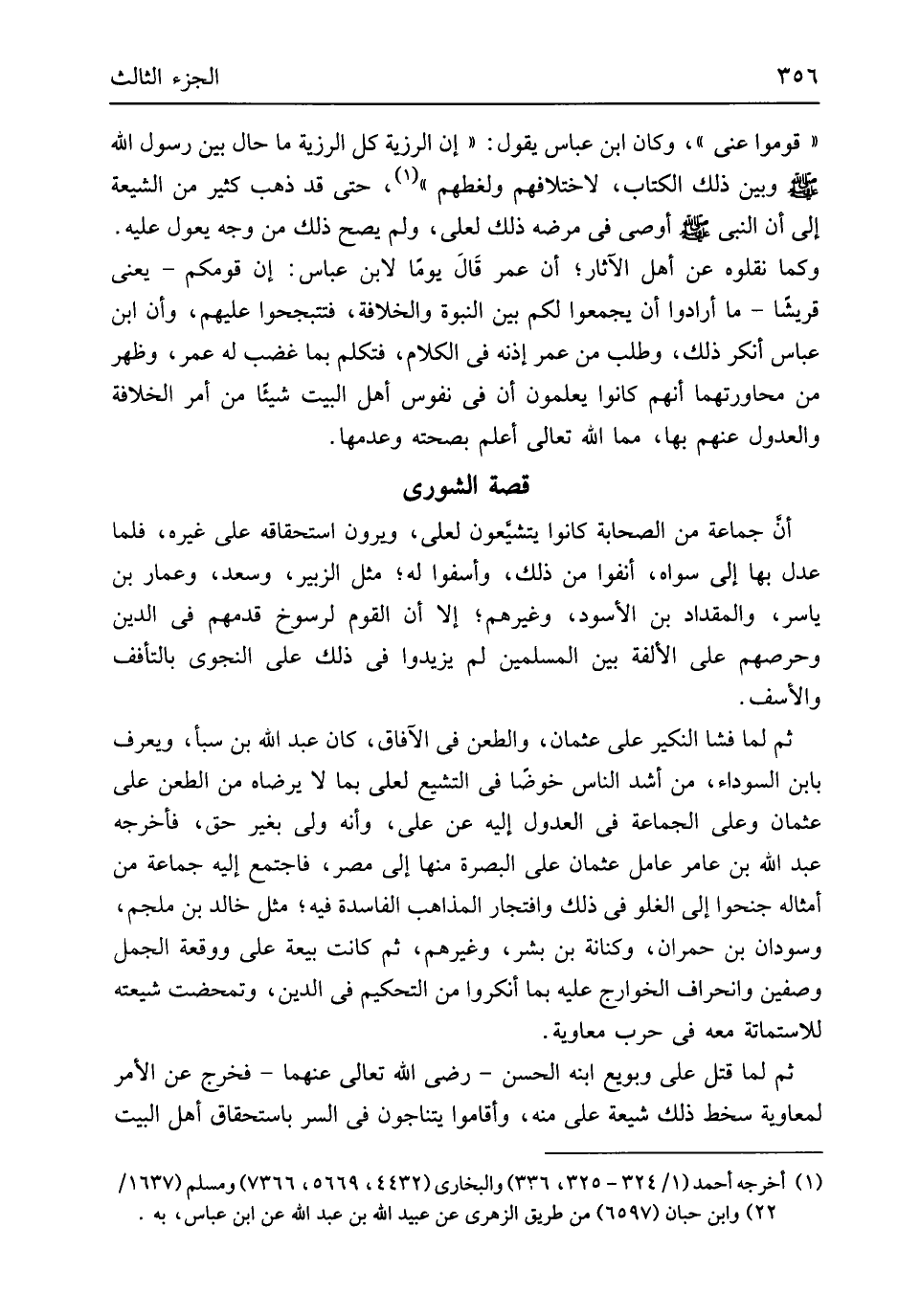 أَن جمَاعَة من الصَّحَابَة كَانُوا يتشيعون لعَلي ويرون اسْتِحْقَاقه على غَيره فَلَمَّا عدل بهَا إِلَى سواهُ أنفوا من ذَلِك وأسفوا لَهُ مثل الزبير وَسعد وعمار بن يَاسر والمقداد بن الْأسود وَغَيرهم إِلَّا أَن الْقَوْم لرسوخ قدمهم فِي الدّين وحرصهم على الألفة بَين الْمُسلمين لم يزِيدُوا فِي ذَلِك على النَّجْوَى بالتأفف والأسف ثمَّ لما فَشَا النكير على عُثْمَان والطعن فِي الْآفَاق كَانَ عبد الله بن سبأ وَيعرف بِابْن السَّوْدَاء من أَشد النَّاس خوضَاً فِي التَّشَيُّع لعَلي بِمَا لَا يرضاه من الطعْن على عُثْمَان وعَلى جمَاعَة فِي الْعُدُول إِلَيْهِ عَن عَليّ وَأَنه ولي بِغَيْر حق فَأخْرجهُ عبد الله بن عَامر عَامل عُثْمَان على الْبَصْرَة مِنْهَا إِلَى مصر فَاجْتمع إِلَيْهِ جمَاعَة من أَمْثَاله جنحوا إِلَى الغلو فِي ذَلِك وافتجار الْمذَاهب الْفَاسِدَة فِيهِ مثل خَالِد بن ملجم وسودان بن حمْرَان وكنانة بن بشر وَغَيرهم ثمَّ كَانَت بيعَة عَليّ ووقعة الْجمل وصفين وانحراف الْخَوَارِج عَلَيْهِ بِمَا أَنْكَرُوا من التَّحْكِيم فِي الدّين وتمحضت شيعته للاستماتة مَعَه فِي حَرْب مُعَاوِيَة ثمَّ لما قتل عَليّ وبويع ابْنه الْحسن رَضِي الله تَعَالَى عَنْهُمَا فَخرج عَن الْأَمر لمعاوية سخط ذَلِك شيعَة عَليّ مِنْهُ وَأَقَامُوا يتناجون فِي السِّرّ اسْتِحْقَاق أهل الْبَيْت