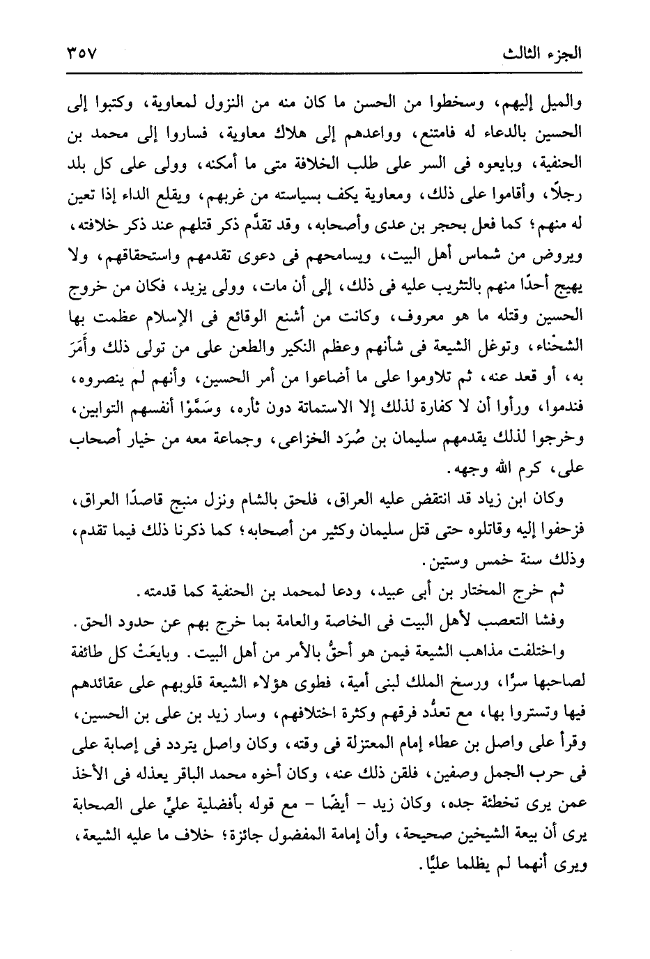 والميل إِلَيْهِم وسخطوا من الْحسن مَا كَانَ مِنْهُ من النُّزُول لمعاوية وَكَتَبُوا إِلَى الْحُسَيْن بِالدُّعَاءِ لَهُ فَامْتنعَ وواعدهم إِلَى هَلَاك مُعَاوِيَة فَسَارُوا إِلَى مُحَمَّد بن الْحَنَفِيَّة وَبَايَعُوهُ فِي السِّرّ على طلب الْخلَافَة مَتى مَا أمكنه وَولى على كل بلد رجلا وَأَقَامُوا على ذَلِك وَمُعَاوِيَة يكف سياسته من غربهم ويقلع الدَّاء إِذا تعين لَهُ مِنْهُم كَمَا فعل بِحجر بن عدي وَأَصْحَابه وَقد تقدم ذكر قَتلهمْ عِنْد ذكر خِلَافَته ويروض من شماس أهل الْبَيْت ويسامحهم فِي دَعْوَى تقدمهم واستحقاقهم وَلَا يهيج أحدا مِنْهُم بالتثريب عَلَيْهِ فِي ذَلِك إِلَى أَن مَاتَ وَولي يزِيد فَكَانَ من خُرُوج الْحُسَيْن وَقَتله مَا هُوَ مَعْرُوف وَكَانَت من أشنع الوقائع فِي الْإِسْلَام عظمت بهَا الشحناء وتوغل الشِّيعَة فِي شَأْنهمْ وَعظم النكير والطعن على من تولى ذَلِك وأَمَرَ بِهِ أَو قعد عَنهُ ثمَّ تَلَاوَمُوا على مَا أضاعوا من أَمر الْحُسَيْن وَأَنَّهُمْ لم ينصروه فَنَدِمُوا وَرَأَوا أَن لَا كَفَّارَة لذَلِك إِلَّا الاستماتة دون ثَأْره وَسموا أنفسم التوابين وَخَرجُوا لذَلِك يقدمهم سُلَيْمَان بن صُرَد الْخُزَاعِيّ وَجَمَاعَة مَعَه من خِيَار أَصْحَاب عَليّ كرم الله وَجهه وَكَانَ ابْن زِيَاد قد انْتقض عَلَيْهِ الْعرَاق فلحق بِالشَّام وَنزل منبج قَاصِدا الْعرَاق فزحفوا إِلَيْهِ وقاتلوه حَتَّى قتل سُلَيْمَان وَكثير من أَصْحَابه كَمَا ذكرنَا فِيمَا تقدم وَذَلِكَ سنة خمس وَسِتِّينَ ثمَّ خرج الْمُخْتَار بن أبي عبيد ودعا لمُحَمد بن الْحَنَفِيَّة كَمَا قَدمته وَفَشَا التعصب لأهل الْبَيْت فِي الْخَاصَّة والعامة بِمَا خرج بهم عَن حُدُود الْحق وَاخْتلفت مَذَاهِب الشِّيعَة فِيمَن هُوَ أحقُّ بِالْأَمر من أهل الْبَيْت وبايعَتْ كل طَائِفَة لصَاحِبهَا سرا ورسخ الْملك لبني أُميَّة فطوى هَؤُلَاءِ الشِّيعَة قُلُوبهم على عقائدهم فِيهَا وتستروا بهَا مَعَ تعدُد فرقهم وَكَثْرَة اخْتلَافهمْ وَسَار زيد بن عَليّ بن الْحُسَيْن وَقَرَأَ على وَاصل بن عَطاء إِمَام الْمُعْتَزلَة فِي وقته وَكَانَ وَاصل يتَرَدَّد فِي إِصَابَة عَليّ فِي حَرْب الْجمل وصفين فلقن ذَلِك عَنهُ وَكَانَ أَخُوهُ مُحَمَّد الباقر يعذله فِي الْأَخْذ عَمَّن يرى تخطئة جده وَكَانَ زيد أَيْضا مَعَ قَوْله بأفضلية عَليّ على الصَّحَابَة يرى أَن بيعَة الشَّيْخَيْنِ صَحِيحَة وَأَن إِمَامَة الْمَفْضُول جَائِزَة خلاف مَا عَلَيْهِ الشِّيعَة وَيرى أَنَّهُمَا لم يظلما عليا