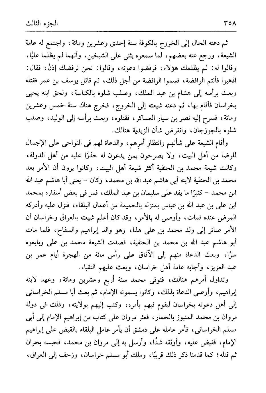 ثمَّ دَعَتْهُ الْحَال إِلَى الْخُرُوج بِالْكُوفَةِ سنة إِحْدَى وَعشْرين وَمِائَة وَاجْتمعَ لَهُ عَامَّة الشِّيعَة وَرجع عَنهُ بَعضهم لما سَمِعُوهُ يثني على الشَّيْخَيْنِ وأنهما لم يظلما عليا وَقَالُوا لَهُ لم يظلمك هَؤُلَاءِ فَرَفَضُوا دَعوته وَقَالُوا نَحن نرفضك إذنْ فَقَالَ اذْهَبُوا فَأنْتم الرافضة فسموا الرافضة من أجل ذَلِك ثمَّ قَاتل يُوسُف بن عمر فَقتله وَبعث بِرَأْسِهِ إِلَى هِشَام بن عبد الْملك وصلب شلوه بالكناسة وَلحق ابْنه يحيى بخراسان فَأَقَامَ بهَا ثمَّ دَعَتْهُ شيعته إِلَى الْخُرُوج فَخرج هُنَاكَ سنة خمس وَعشْرين وَمِائَة فسرح إِلَيْهِ نصر بن سيار العساكر فَقَتَلُوهُ وَبعث بِرَأْسِهِ إِلَى الْوَلِيد وصلب شلوه بالجوزجان وانقرض شَأْن الزيدية هُنَالك وَأقَام الشِّيعَة على شَأْنهمْ وانتظارِ أمرِهم والدعاة لَهُم فِي النواحي على الْإِجْمَال للرضا من أهل الْبَيْت وَلَا يصرحون بِمن يدعونَ لَهُ حذرا عَلَيْهِ من أهل الدولة وَكَانَت شيعَة مُحَمَّد بن الْحَنَفِيَّة أَكثر شيعَة أهل الْبَيْت وَكَانُوا يرَوْنَ أَن الْأَمر بعد مُحَمَّد بن الْحَنَفِيَّة لِابْنِهِ أبي هَاشم عبد الله بن مُحَمَّد وَكَانَ يَعْنِي أَبَا هَاشم عبد الله ابْن مُحَمَّد كثيرَاً مَا يفد على سُلَيْمَان بن عبد الْملك فَمر فِي بعض أَسْفَاره بِمُحَمد ابْن عَليّ بن عبد الله بن عَبَّاس بمنزله بالحميمة من أَعمال البلقاء فَنزل عَلَيْهِ وأدركه الْمَرَض عِنْده فَمَاتَ وَأوصى لَهُ بِالْأَمر وَقد كَانَ أعلم شيعته بالعراق وخرسان أَن الْأَمر صائر إِلَى ولد مُحَمَّد بن عَليّ هَذَا وَهُوَ وَالِد إِبْرَاهِيم والسفاح فَلَمَّا مَاتَ أَبُو هَاشم عبد الله بن مُحَمَّد بن الْحَنَفِيَّة قصدت الشِّيعَة مُحَمَّد بن عَليّ وَبَايَعُوهُ سرا وَبعث الدعاة مِنْهُم إِلَى الْآفَاق على رَأس مائَة من الْهِجْرَة أَيَّام عمر بن عبد الْعَزِيز وأجابه عَامَّة أهل خرسان وَبعث عَلَيْهِم النُّقَبَاء وتداول أَمرهم هُنَالك فَتوفي مُحَمَّد سنة أَربع وَعشْرين وَمِائَة وعهد لِابْنِهِ إِبْرَاهِيم وَأوصى الدعاة بذلك وَكَانُوا يسمونه الإِمَام ثمَّ بعث أَبَا مُسلم الخرساني إِلَى أهل دَعوته بخرسان لقوم فيهم بأَمْره وَكتب إِلَيْهِم بولايته وَذَلِكَ فِي دولة مَرْوَان بن مُحَمَّد المنبوز بالحمار فعثر مَرْوَان على كتاب من إِبْرَاهِيم الإِمَام إِلَى أبي مُسلم الخرساني فَأمر عَامله على دمشق أَن يَأْمر عَامل البلقاء بِالْقَبْضِ على إِبْرَاهِيم الإِمَام فَقبض عَلَيْهِ وأوثقه شدُّاً وَأرْسل بِهِ إِلَى مَرْوَان بن مُحَمَّد فحبسه بحران ثمَّ قَتله كَمَا قدمنَا ذكر ذَلِك قَرِيبا وَملك أَبُو مُسلم خُرَاسَان وزحف إِلَى الْعرَاق