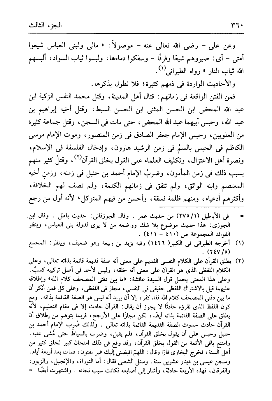 وَعَن عَليّ رَضِي الله تَعَالَى عَنهُ مَوْصُولا مَالِي ولبني الْعَبَّاس شيعوا أمتِي أَي صيروهم شيعَاً وفرقاً وسفكوا دماءها ولبسوا ثِيَاب السوَاد ألبسهم الله ثِيَاب النَّار رَوَاهُ الطَّبَرَانِيّ وَالْأَحَادِيث الْوَارِدَة فِي ذممهم كَثِيرَة فَلَا نطول بذكرها فَمن الْفِتَن الْوَاقِعَة فِي زمانهم قتال أهل الْمَدِينَة وَقتل مُحَمَّد النَّفس الزكية ابْن عبد الله الْمَحْض ابْن الْحسن الْمثنى ابْن الْحسن السبط وَقتل أَخِيه إِبْرَاهِيم بن عبد الله وَحبس أَبِيهِمَا عبد لله الْمَحْض حَتَّى مَاتَ فِي السجْن وَقتل جمَاعَة كَثِيرَة من العلويين وَحبس الإِمَام جَعْفَر الصَّادِق فِي زمن الْمَنْصُور وَمَوْت الإِمَام مُوسَى الكاظم فِي الْحَبْس بالسم فِي زمن الرشيد هَارُون وَإِدْخَال الفلسفة فِي الْإِسْلَام ونصرة أهل الاعتزال وتكليف الْعلمَاء على القَوْل بِخلق الْقُرْآن وقتلُ كثير مِنْهُم بِسَبَب ذَلِك فِي زمن الْمَأْمُون وضربُ الإِمَام أَحْمد بن حَنْبَل فِي زَمَنه وزمنِ أَخِيه المعتصم وَابْنه الواثق وَلم تتفق فِي زمانهم الْكَلِمَة وَلم تصف لَهُم الْخلَافَة وَأَكْثَرهم أدعياء وَمِنْهُم ظلمَة فسقة وَأحسن من فيهم المتَوَكل لِأَنَّهُ أول من رَجَعَ