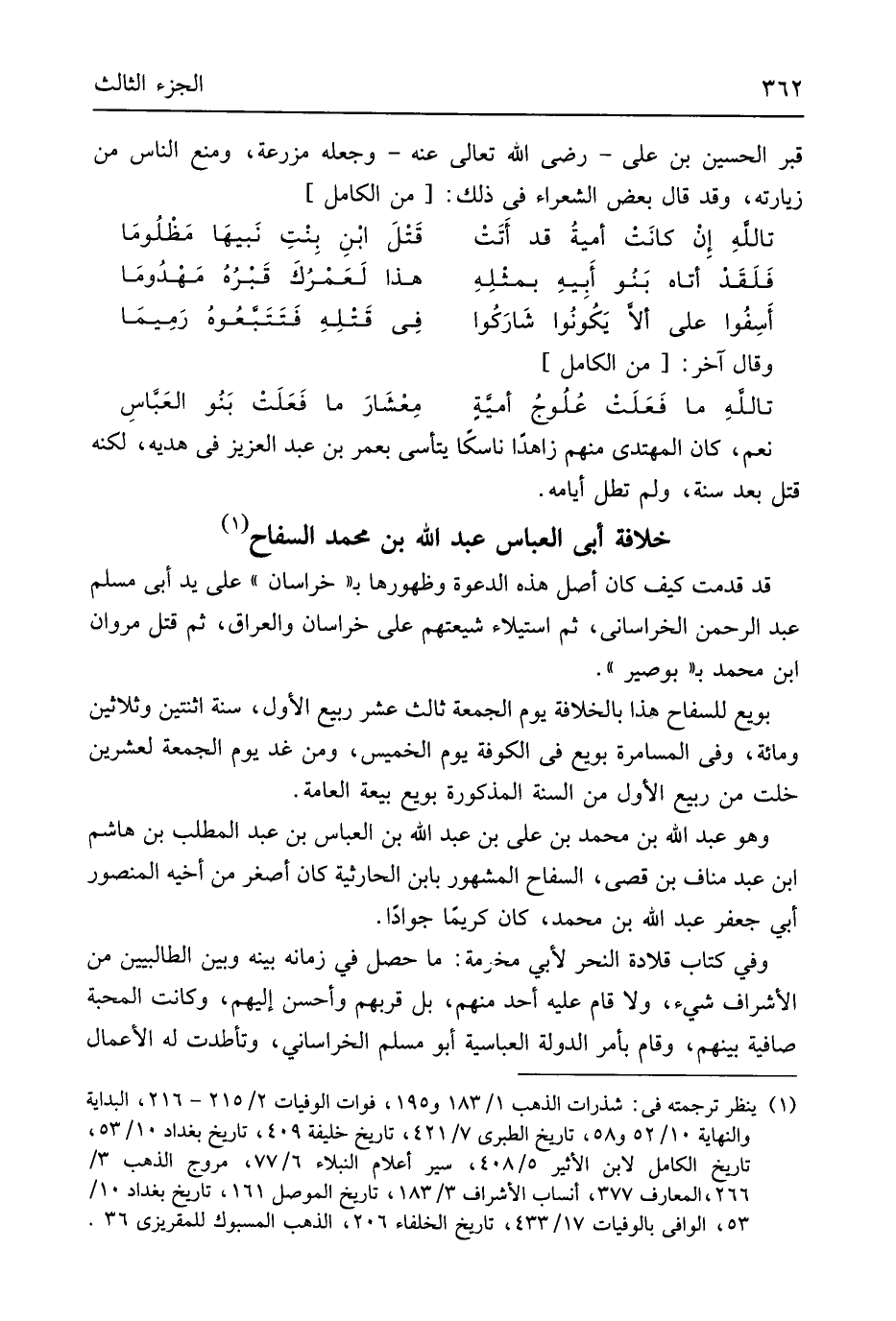 قد قدمت كَيفَ كَانَ أصل هَذِه الدعْوَة وظهورها بخراسان على يَد أبي مُسلم عبد الرَّحْمَن الْخُرَاسَانِي ثمَّ اسْتِيلَاء شيعتهم على خُرَاسَان وَالْعراق ثمَّ قتل مَرْوَان ابْن مُحَمَّد ببوصير بُويِعَ للسفاح هَذَا بالخلافة يَوْم الْجُمُعَة ثَالِث عشر ربيع الأول سنة اثْنَتَيْنِ وَثَلَاثِينَ وَمِائَة وَفِي المسامرة بُويِعَ فِي الْكُوفَة يَوْم الْخَمِيس وَمن غَد يَوْم الْجُمُعَة لعشرين خلت من ربيع الأول من السّنة الْمَذْكُورَة بُويِعَ بيعَة الْعَامَّة وَهُوَ عبد الله بن مُحَمَّد بن عَليّ بن عبد الله بن الْعَبَّاس بن عبد الْمطلب بن هَاشم ابْن عبد منَاف بن قصي السفاح الْمَشْهُور بِابْن الحارثية كَانَ أَصْغَر من أَخِيه الْمَنْصُور أبي جَعْفَر عبد الله بن مُحَمَّد كَانَ كَرِيمًا جواداً وَفِي كتاب قلادة النَّحْر لأبي مخرمَة مَا حصل فِي زَمَانه بَينه وَبَين الطالبين من الْأَشْرَاف شَيْء وَلَا قَامَ عَلَيْهِ أحد مِنْهُم بل قربهم وَأحسن إِلَيْهِم وَكَانَت الْمحبَّة صَافِيَة بَينهم وَقَامَ بِأَمْر الدولة العباسية أَبُو مُسلم الخرساني وتأطدت لَهُ الْأَعْمَال