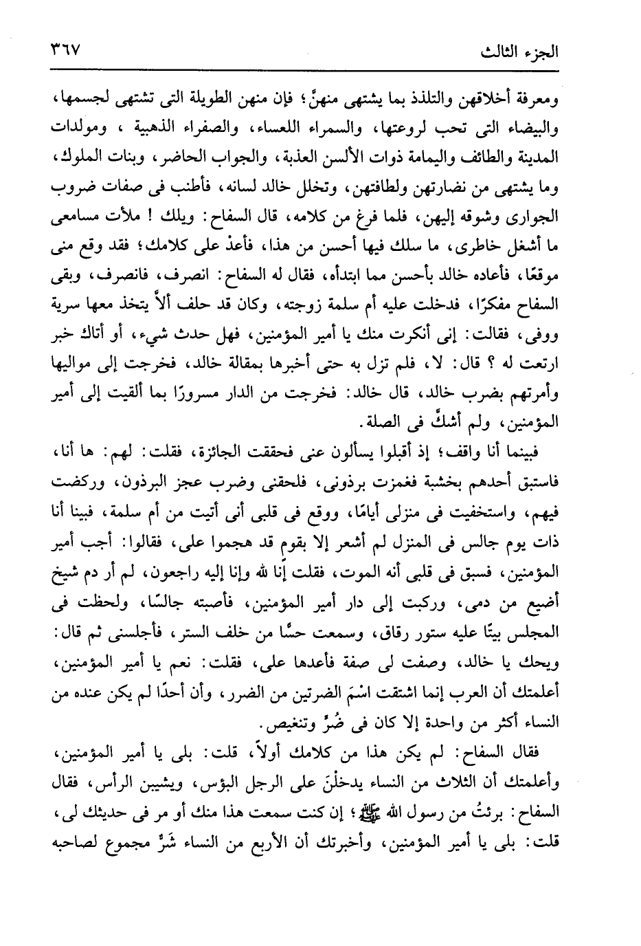 وَمَعْرِفَة أخلاقهن والتلذذ بِمَا يَشْتَهِي مِنْهُنَّ فَإِن مِنْهُنَّ الطَّوِيلَة الَّتِي تشْتَهي لجسمها والبيضاء الَّتِي تحب لروعتها والسمراء اللعساء والصفراء الذهبية ومولدات الْمَدِينَة والطائف واليمامة ذَوَات الألسن العذبة وَالْجَوَاب الْحَاضِر وَبَنَات الْمُلُوك وَمَا يَشْتَهِي من نضارتهن ولطافتهن وتخلل خَالِد لِسَانه فأطنب فِي صِفَات ضروب الْجَوَارِي وشوقه إلَيْهِنَّ فَلَمَّا فرغ من كَلَامه قَالَ السفاح وَيلك مَلَأت مسامعي مَا أشغل خاطري مَا سلك فِيهَا أحسن من هَذَا فأعدْ على كلامك فقد وَقع مني موقعا فَأَعَادَ خَالِد بِأَحْسَن مِمَّا ابتدأه فَقَالَ لَهُ السفاح انْصَرف فَانْصَرف وَبَقِي السفاح مفكراً فَدخلت عَلَيْهِ أم سَلمَة وَزَوجته وَكَانَ قد حلف ألاَ يتَّخذ مَعهَا سَرِيَّة ووفى فَقَالَت إِنِّي أنْكرت مِنْك يَا أَمِير الْمُؤمنِينَ فَهَل حدث شَيْء أَو أَتَاك خبر ارتعت لَهُ قَالَ لَا فَلم تزل بِهِ حَتَّى أخْبرهَا بمقالة خَالِد فَخرجت إِلَى مواليها وأمرتهم بِضَرْب خَالِد قَالَ خَالِد فَخرجت من الدَّار مَسْرُورا بِمَا ألقيت إِلَى أَمِير الْمُؤمنِينَ وَلم أَشك فِي الصِّلَة فَبَيْنَمَا أَنا وَاقِف إِذْ أَقبلُوا يسْأَلُون عني فحققت الْجَائِزَة فَقلت لَهُم هَا أَنا فَاسْتَبق أحدهم بخشبة فغمزت برذوني فلحقني وَضرب عجز البرذون وركضت فيهم واستخفيت فِي منزلي أَيَّامًا وَوَقع فِي قلبِي أَنِّي أتيت من أم سَلمَة فَبينا أَنا ذَات يَوْم جَالس فِي الْمنزل لم أشعر إِلَّا بقومٍ قد هجموا عَليّ فَقَالُوا أجب أَمِير الْمُؤمنِينَ فَسبق فِي قلبِي أَنه الْمَوْت فَقلت إِنَّا لله وَإِنَّا إِلَيْهِ رَاجِعُون لم أر دم شيخ أضيع من دمي وَركبت إِلَى دَار أَمِير الْمُؤمنِينَ فَأَصَبْته جَالِسا ولحظت فِي الْمجْلس بَيْتا عَلَيْهِ ستور رقاق وَسمعت حسا من خلف السّتْر فأجلسني ثمَّ قَالَ ويجك يَا خَالِد وصفت لي صفة فأعدها عَليّ فَقلت نعم يَا أَمِير الْمُؤمنِينَ أعلمتك أَن الْعَرَب إِنَّمَا اشْتقت اسْمَ الضرتين من الضَّرَر وَأَن أحدا لم يكن عِنْده من النِّسَاء أَكثر من وَاحِدَة إِلَّا كَانَ فِي ضُر وتنغيص فَقَالَ السفاح لم يكن هَذَا من كلامك أَولا قلت بلَى يَا أَمِير الْمُؤمنِينَ وأعلمتك أَن الثَّلَاث من النِّسَاء يدخلنَ على الرجل الْبُؤْس ويشيبن الرَّأْس فَقَالَ السفاح برئتُ من رَسُول الله