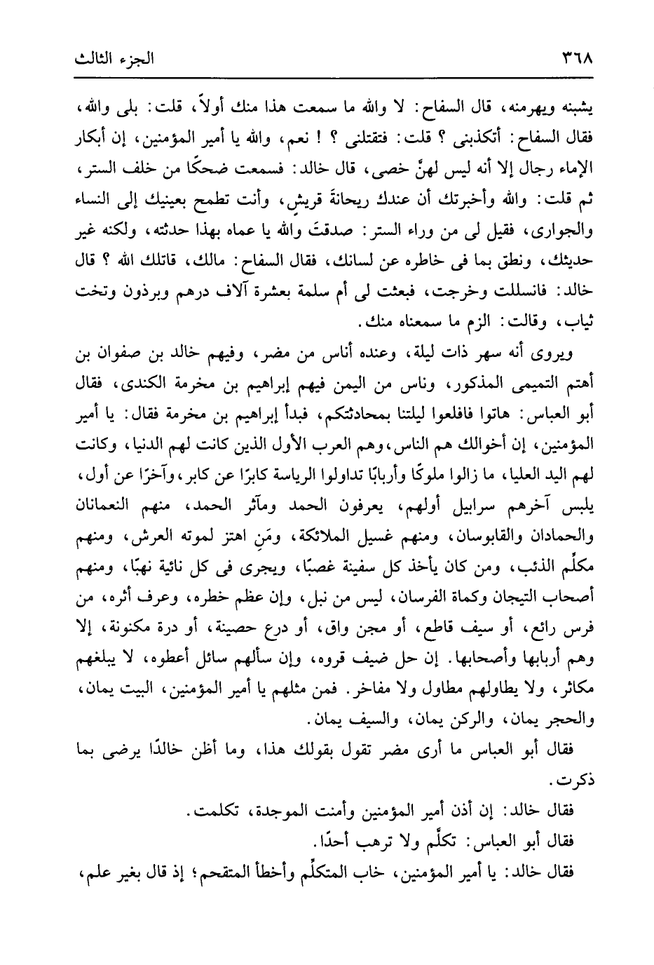 يشبنه ويهرمنه قَالَ اسفاح لَا وَالله مَا سَمِعت هَذَا مِنْك أَولا قلت بلَى وَالله فَقَالَ السفاح أتكذبني قلت فتقتلني نعم وَالله يَا أَمِير الْمُؤمنِينَ إِن أبكار الْإِمَاء رجال إِلَّا أَنه لَيْسَ لَهُنَّ خصي قَالَ خَالِد فَسمِعت ضحكاً من خلف السّتْر ثمَّ قلت وَالله وأخبرتك أَن عنْدك رَيْحَانَة قِرْش وَأَنت تطمح بِعَيْنَيْك إِلَى النِّسَاء والجواري فَقيل لي من وَرَاء السّتْر صدقتَ وَالله يَا عماه بِهَذَا حدثته وَلكنه غير حَدِيثك ونطق بِمَا فِي خاطره عَن لسَانك فَقَالَ السفاح مَالك قَاتلك الله قَالَ خَالِد فانسللت وَخرجت فَبعثت لي أم سَلمَة بِعشْرَة آلَاف دِرْهَم وبرذون وتخت ثِيَاب وَقَالَت الزم مَا سمعناه مِنْك ويروى أَنه سهر ذَات لَيْلَة وَعِنْده أنَاس من مُضر وَفِيهِمْ خَالِد بن صَفْوَان بن أهتم التَّمِيمِي الْمَذْكُور وناس من الْيمن فيهم إِبْرَاهِيم بن مخرمَة الْكِنْدِيّ فَقَالَ أَبُو الْعَبَّاس هاتوا فافعلوا ليلتنا بمحادثتكم فَبَدَأَ إِبْرَاهِيم بن مخرمَة فَقَالَ يَا أَمِير الْمُؤمنِينَ إِن أخوالك هم النَّاس وهم الْعَرَب الأول الَّذين كَانَت لَهُم الدُّنْيَا وَكَانَت لَهُم الْيَد الْعليا مَا زَالُوا ملوكاً وأربابا تداولوا الرياسة كَابِرًا عَن كَابر وَآخر عَن أول يلبس آخِرهم سرابيل أَوَّلهمْ يعْرفُونَ الْحَمد ومآثر الْحَمد مِنْهُم النعمانان والحمادان والقابوسان وَمِنْهُم غسيل الْمَلَائِكَة ومَنِ اهتز لمَوْته الْعَرْش وَمِنْهُم مُكَلم الذِّئْب وَمن كَانَ يَأْخُذ كل سفينة غصبَاً وَيجْرِي فِي كل نائية نهبَاً وَمِنْهُم أَصْحَاب التيجان وكماة الفرسان لَيْسَ من نبل وَإِن عظم خطره وَعرف أَثَره من فرس رائع أَو سيف قَاطع أَو مجن واق أَو درع حَصِينَة أَو درة مكنونةَ إِلَّا وهم أَرْبَابهَا وأصحابها إِن حل صيف قروه وَإِن سَأَلَهُمْ سَائل أَعْطوهُ لَا يبلغهم مُكَاثِر وَلَا يطاولهم مطاول وَلَا مفاخر فَمن مثلهم يَا أَمِير الْمُؤمنِينَ الْبَيْت يمَان وَالْحجر يمَان والركن يمَان وَالسيف يمَان فَقَالَ أَبُو الْعَبَّاس مَا أرى مُضر تَقول بِقَوْلِك هَذَا وَمَا أَظن خَالِدا يرضى بِمَا ذكرت فَقَالَ خَالِد إِن أذن أَمِير الْمُؤمنِينَ وَأمنت الموجدة تَكَلَّمت فَقَالَ أَبُو الْعَبَّاس تكلم وَلَا ترهب أحدا فَقَالَ خَالِد يَا أَمِير الْمُؤمنِينَ خَابَ الْمُتَكَلّم وَأَخْطَأ المقتحم إِذْ قَالَ بِغَيْر علم