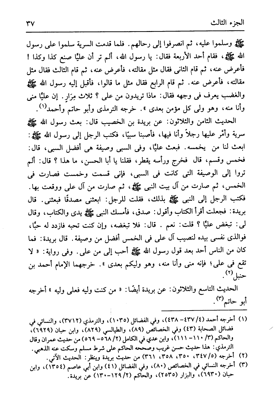 وَالْغَضَب يعرف فِي وَجهه فَقَالَ مَاذَا تُرِيدُونَ من عَليّ ثَلَاث مِرَارٍ إِن عليا مني وَأَنا مِنْهُ وَهُوَ ولي كل مُؤمن بعدِي خرجه التِّرْمِذِيّ وَأَبُو حَاتِم وَأحمد الحَدِيث الثَّامِن والثلاتون