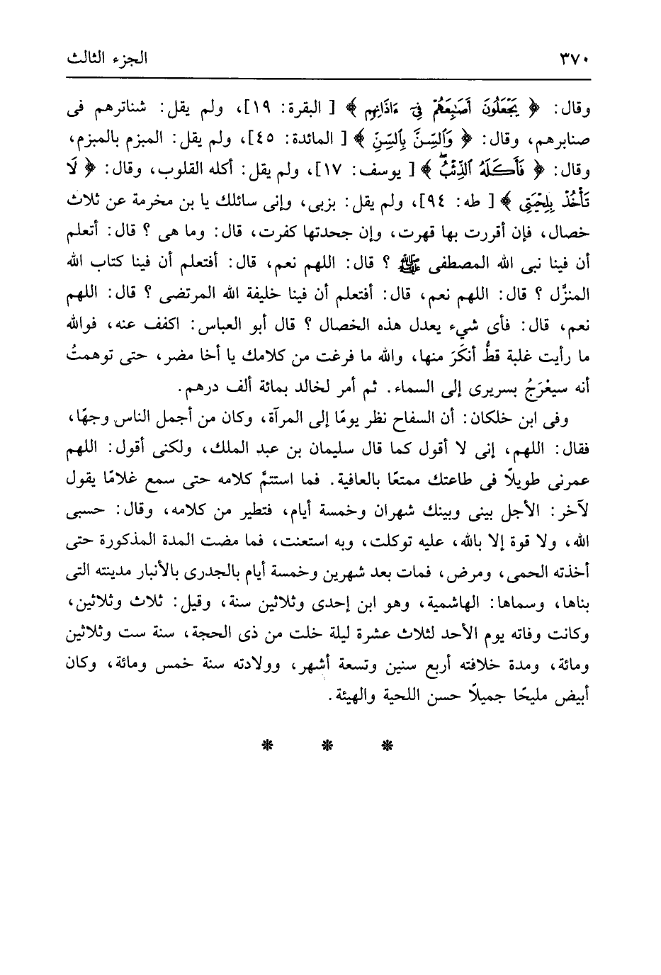 وَقَالَ {يجعَلوُنَ أَصاَبِعهُم فِي آذَانهم} الْبَقَرَة 19 وَلم يقل شناترهم فِي صنابرهم وَقَالَ {وَالسِّنَّ بِاَلسِّن} الْمَائِدَة 45 وَلم يقل المبزم بالمبزم وَقَالَ {فَأكَلَهُ الذِّئْب} وسف 17 وَلم يقل أكله الْقُلُوب وَقَالَ {لَا تَأخذْ بِلِحيتَي} طه 94 وَلم يقل بزبي وَإِنِّي سَائِلك يَا ابْن مخرجة عَن ثَلَاث خِصَال فن أَقرَرت بهَا قهرت وَإِن جحدتها كفرت قَالَ وَمَا هِيَ قَالَ أتعلم أَن فِينَا نَبِي الله الْمُصْطَفى